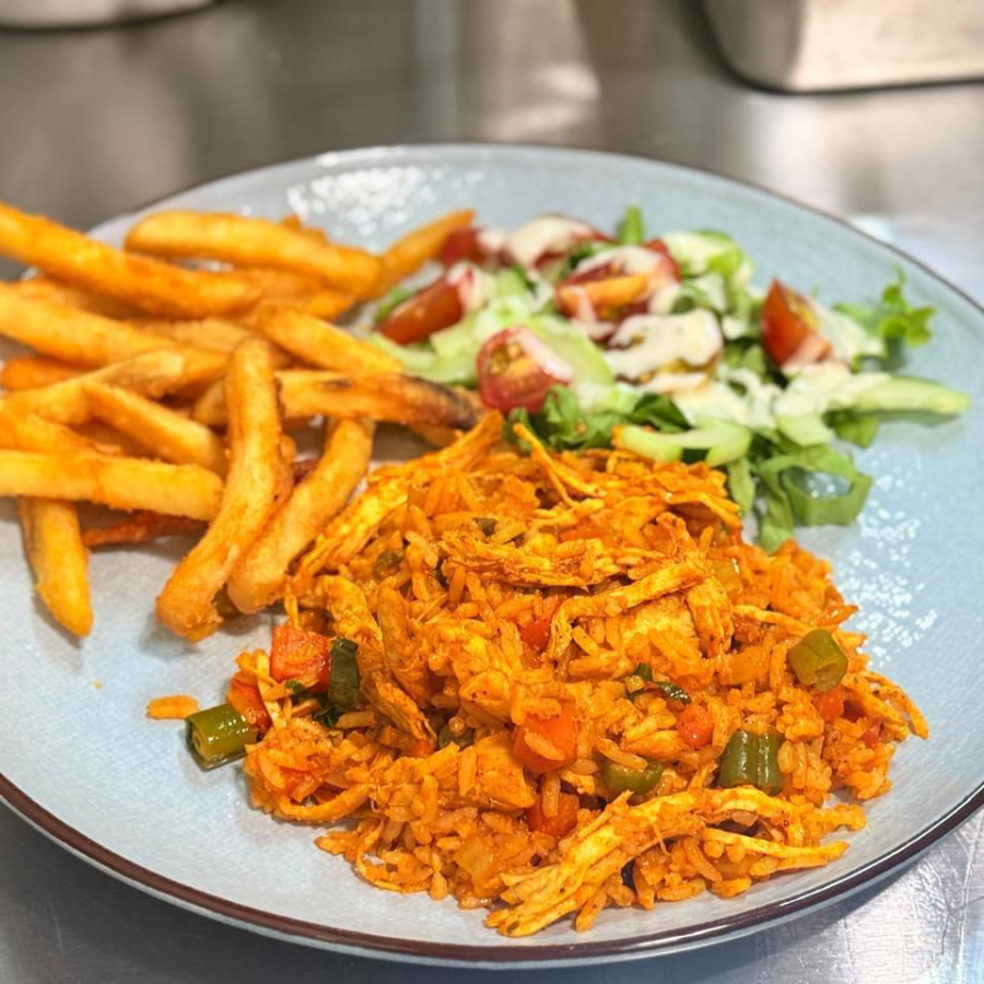 Arroz desmenuzado con pollo y vegetales, acompañado con papas fritas y ensalada.