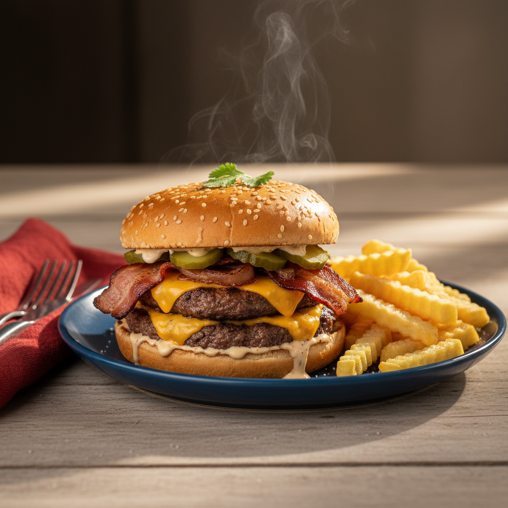 Doble torta de carne, queso, lechuga, tomate, pepinillos, tocineta, salsa de la casa acompañado con papas.