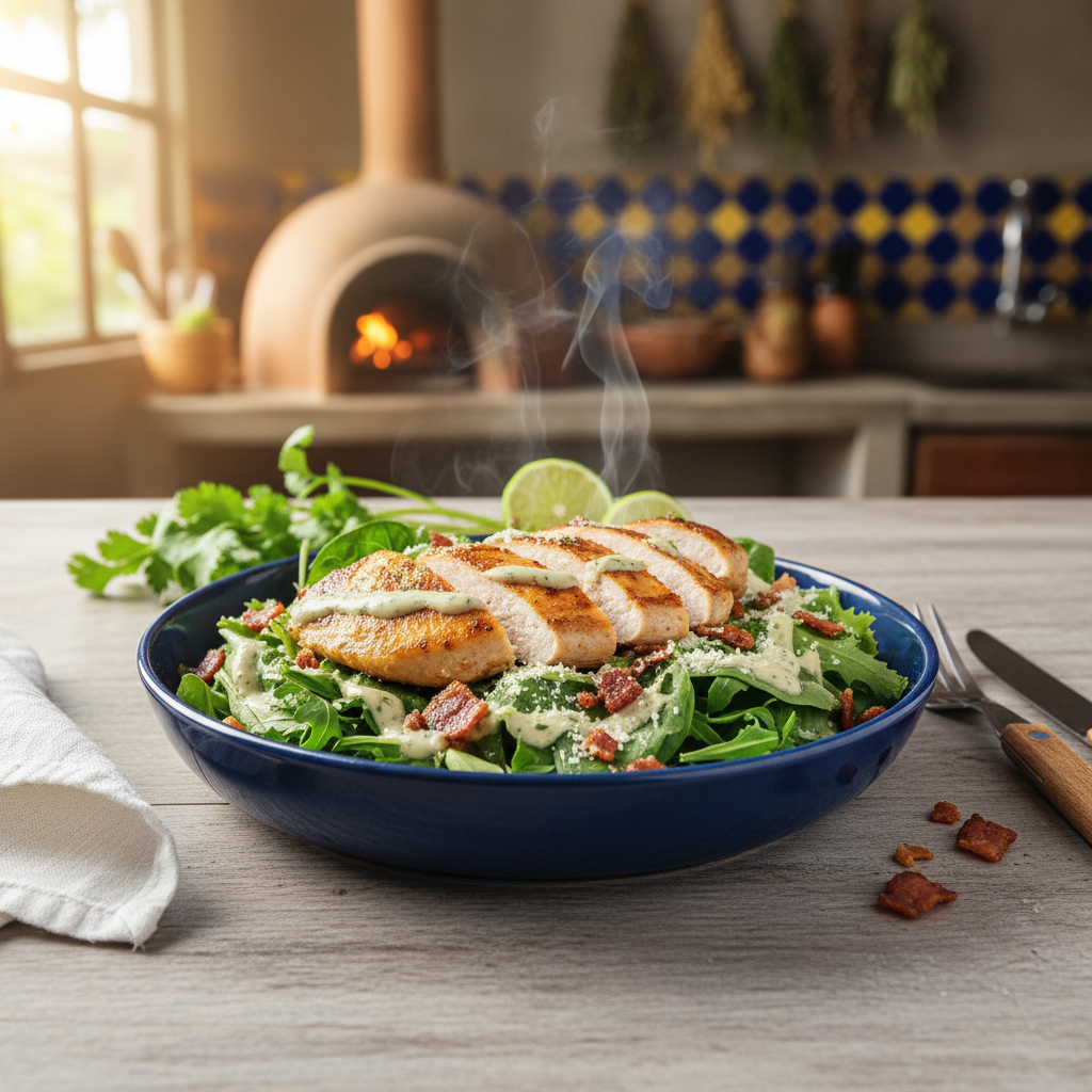 Pechuga de pollo con un mix de lechugas, tocineta, parmesano rallado y aderezo de la casa.