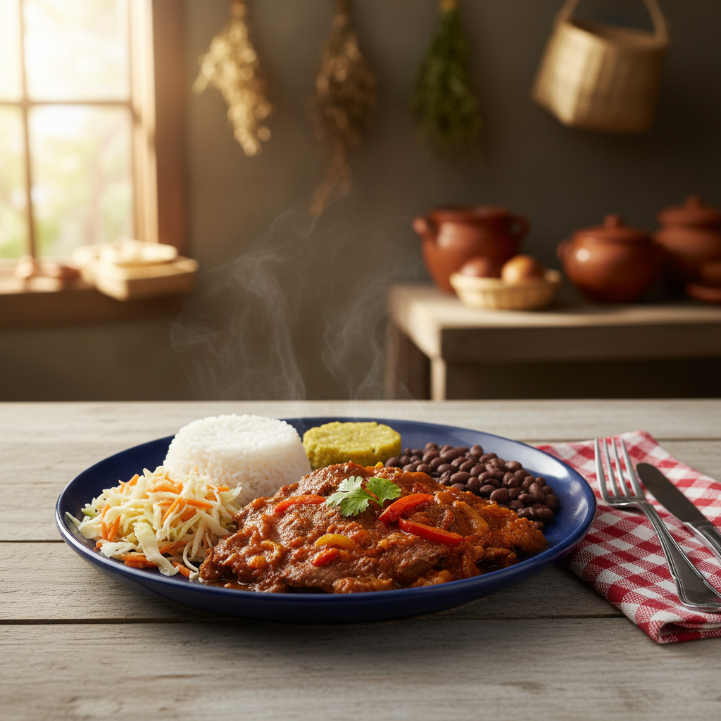 Tradicional plato costarricense con carne de res en salsa, servido con arroz, frijoles y dos guarniciones a elegir.