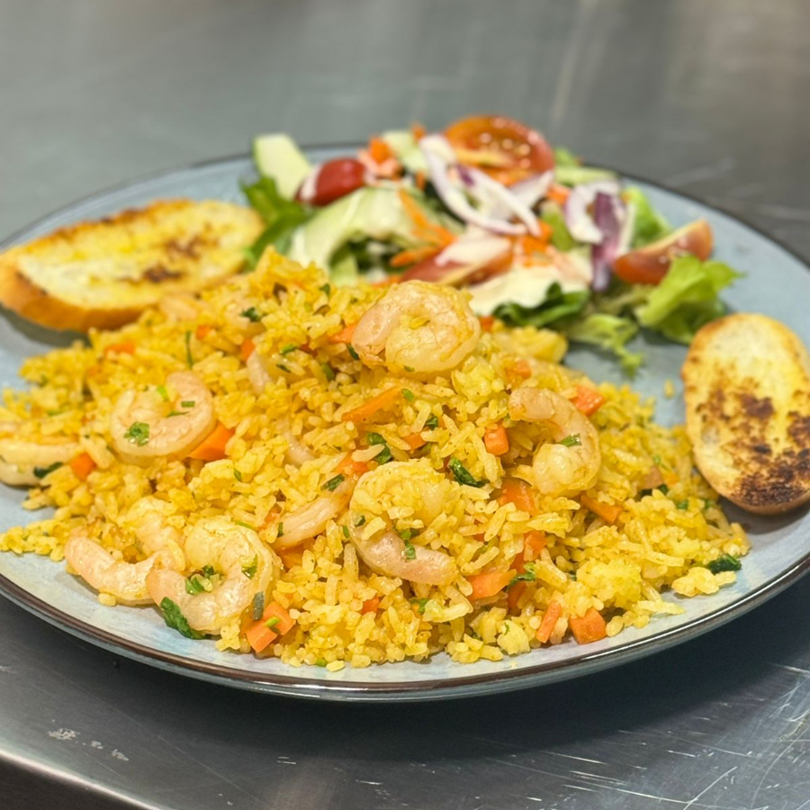 Arroz preparado con camarones frescos y especias, acompañado con papas fritas y ensalada.