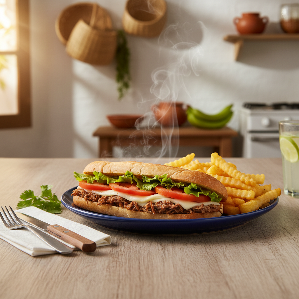 Carne mechada, tomate, lechuga, queso acompañado con papas fritas.