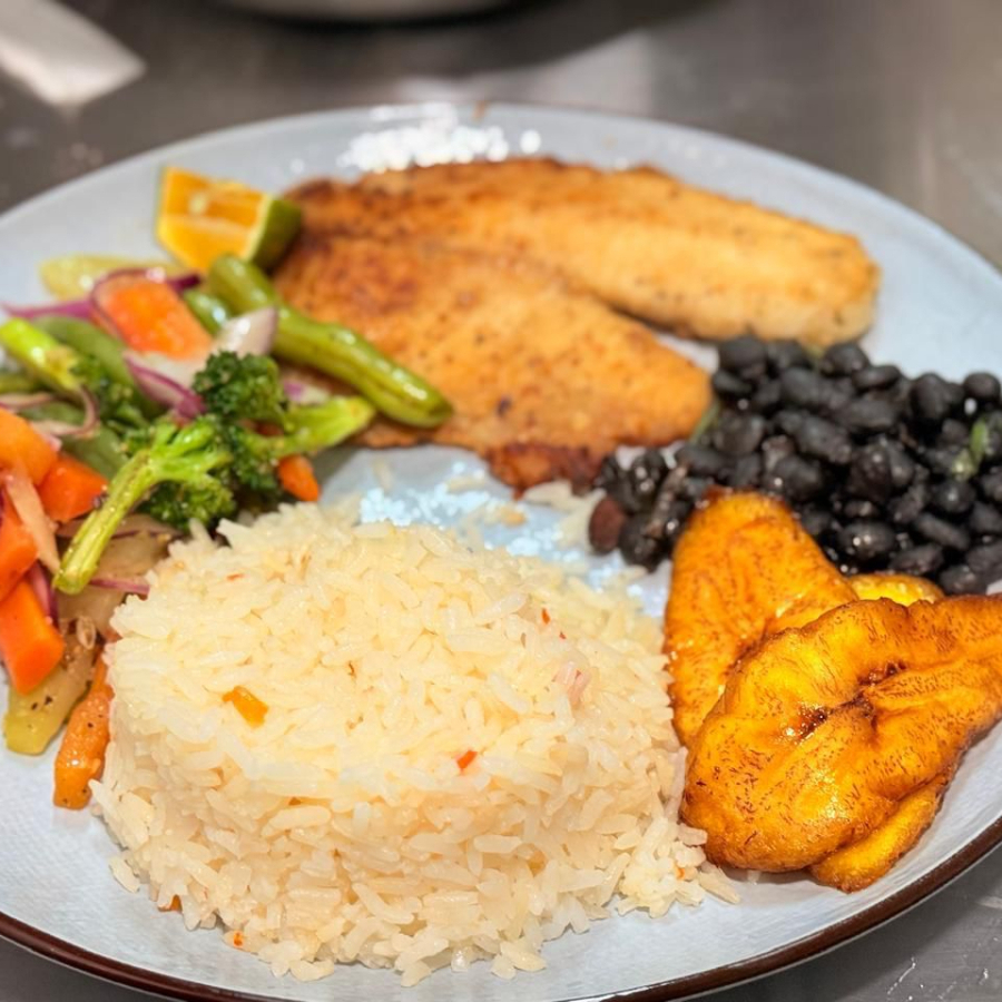 Tradicional plato costarricense con filete de pescado, servido con arroz, frijoles y dos guarniciones a elegir.