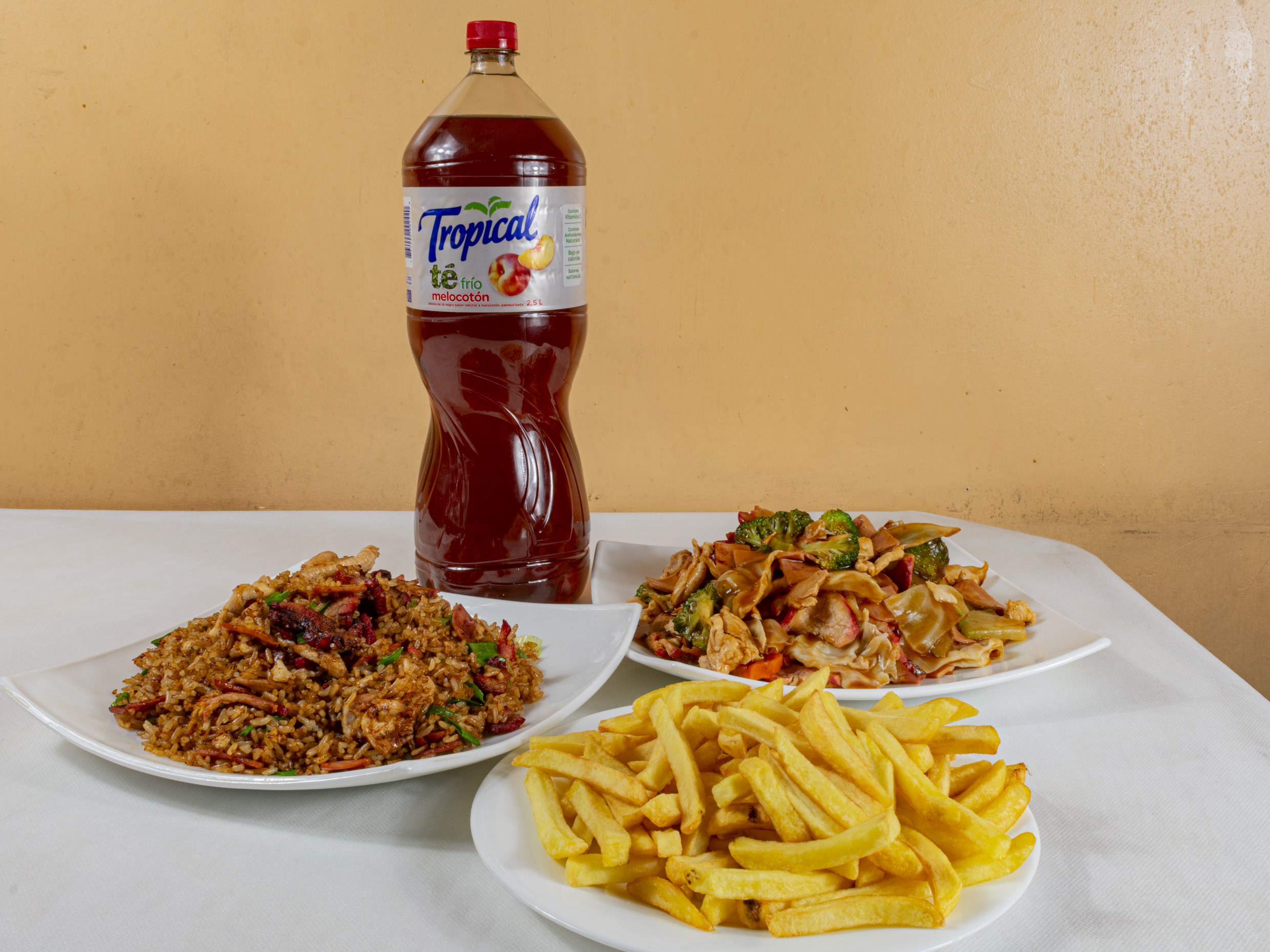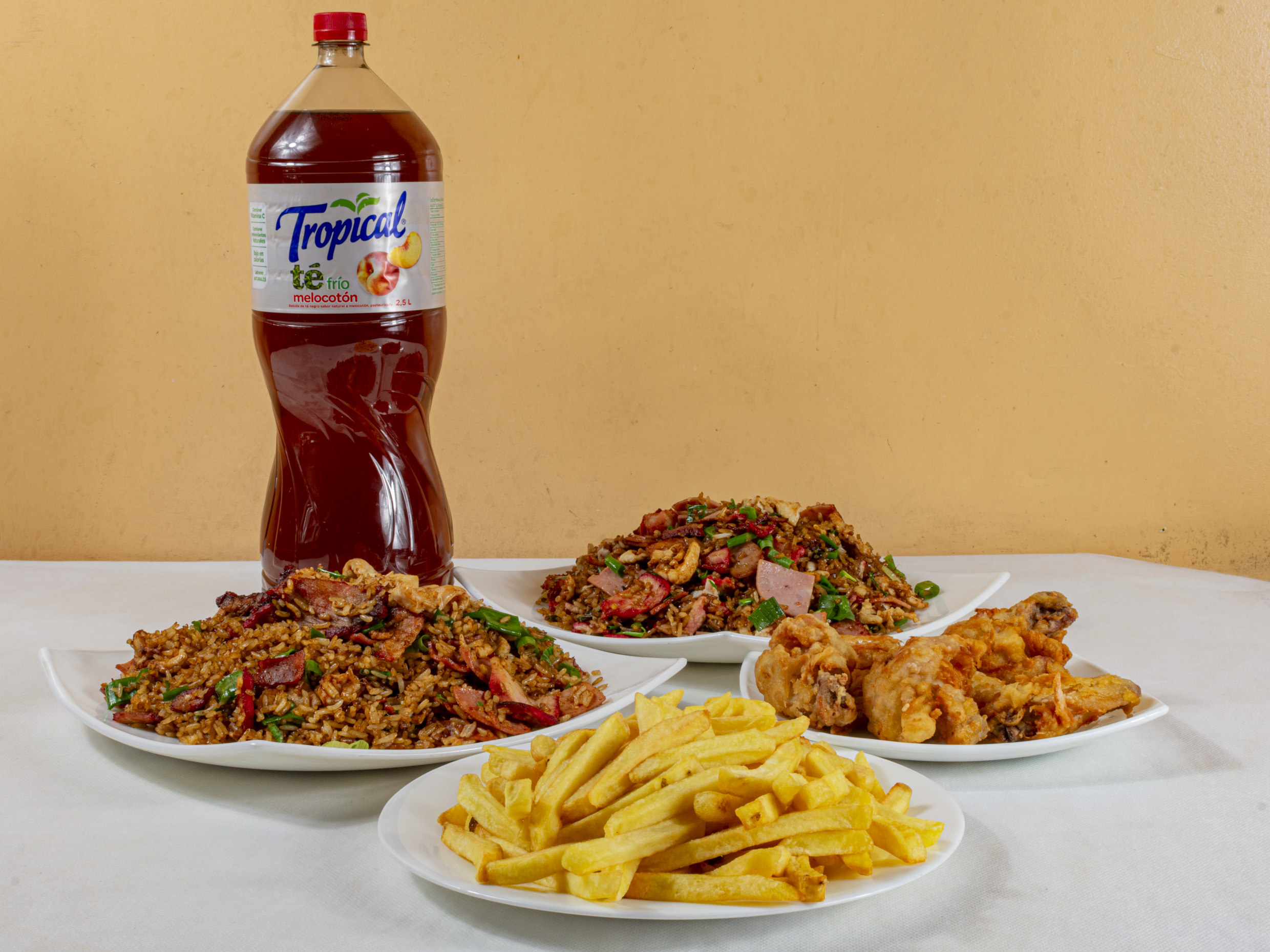 Un Entero Arroz Cantonés + Un Entero Chop Suey + Un Papas Fritas Grande +Un Fresco Tropical 2.5 Litros