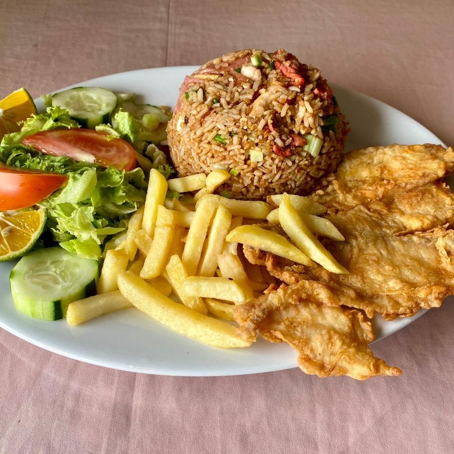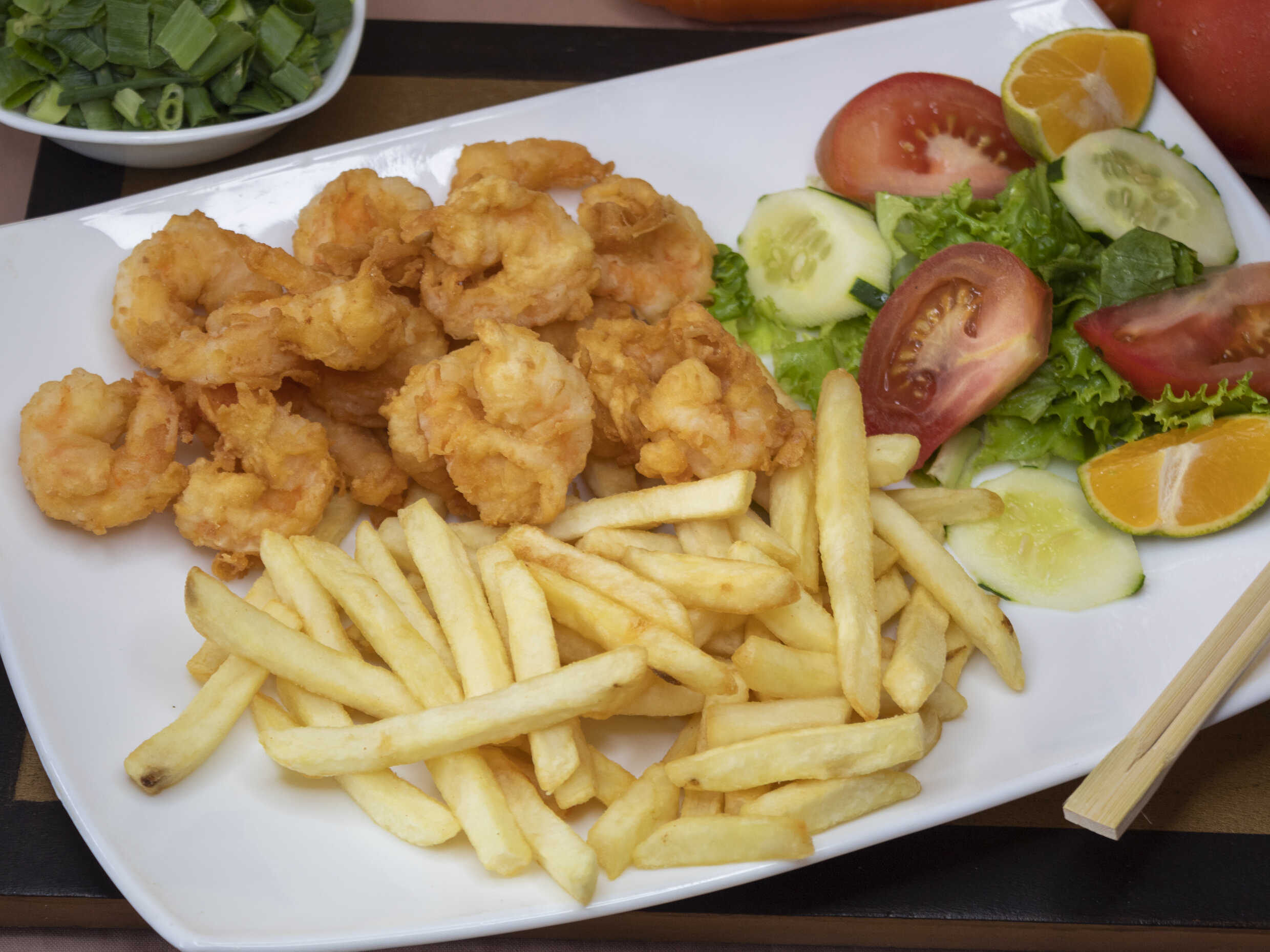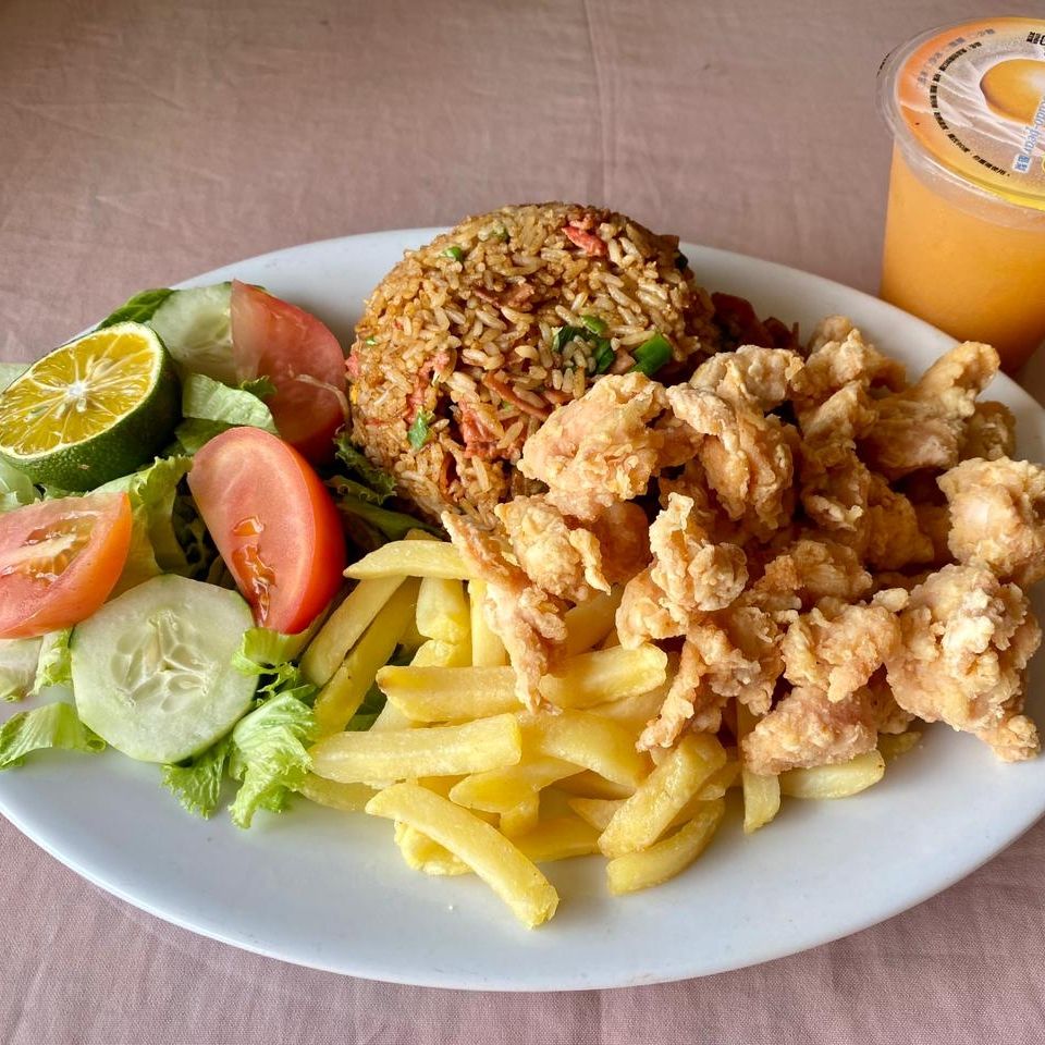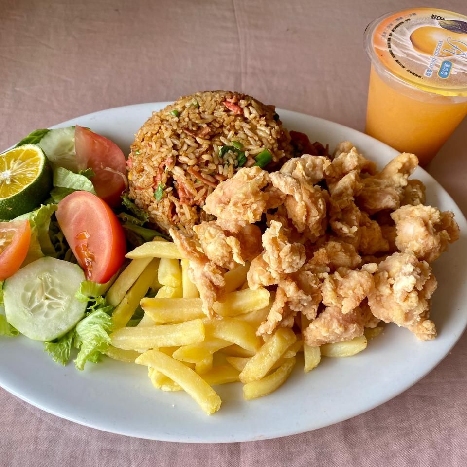 Arroz cantones or Arroz Blanco con papas, ensalada y camarón empanizado incluye refresco natural 12 onzas.