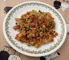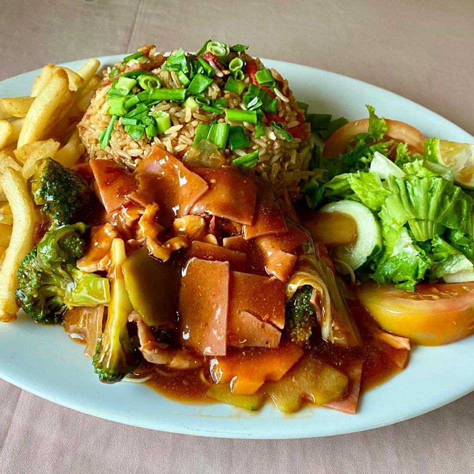 Arroz cantones or arroz banco con papas ensalada y trocito pollo or cerdo en salsa agridulce