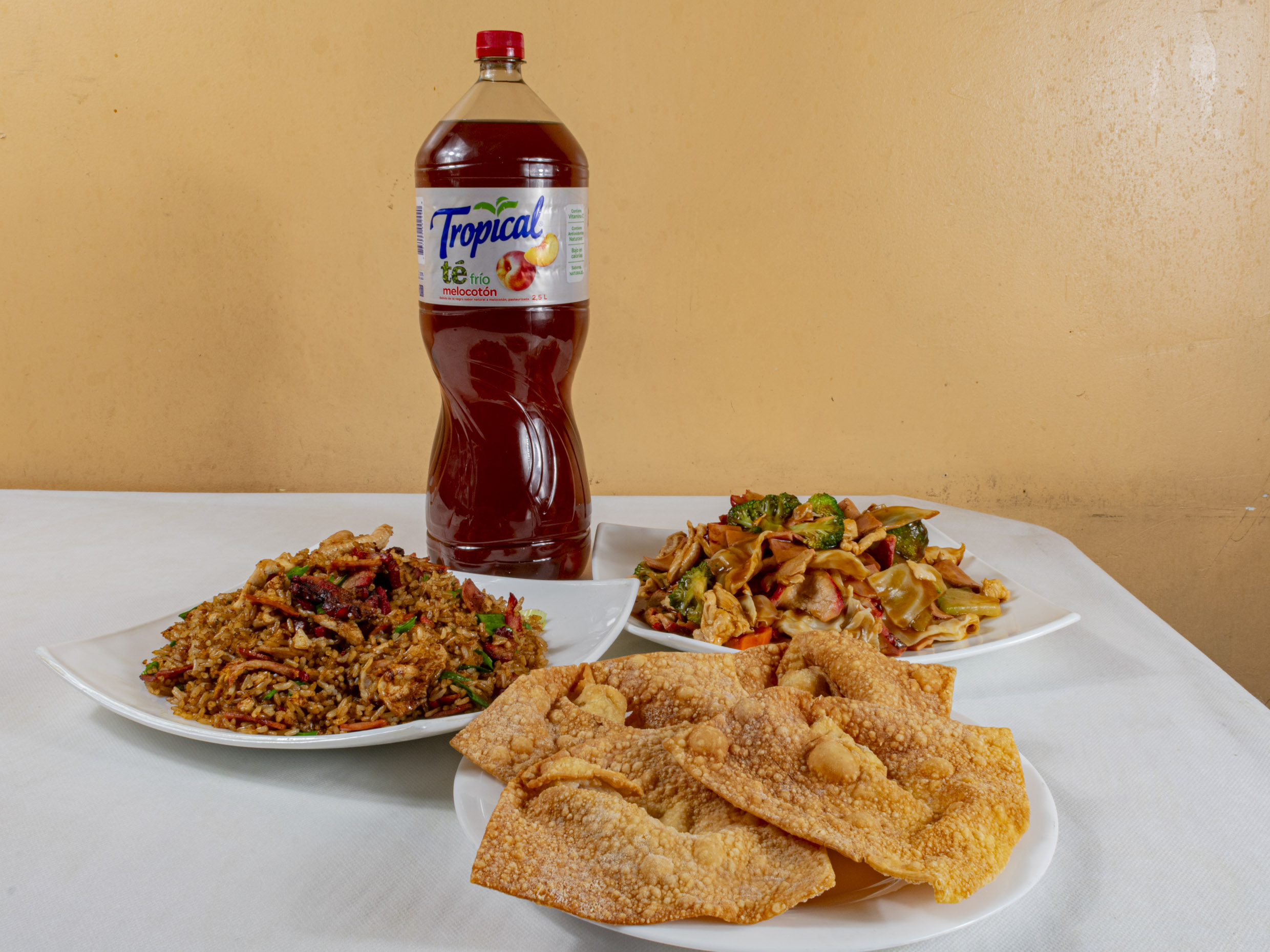 Un Entero Arroz Cantonés + Un Entero Chop Suey + Ocho Wantan Fritas Con Salsa Agridulce + Un Fresco Tropical 2.5 Litros