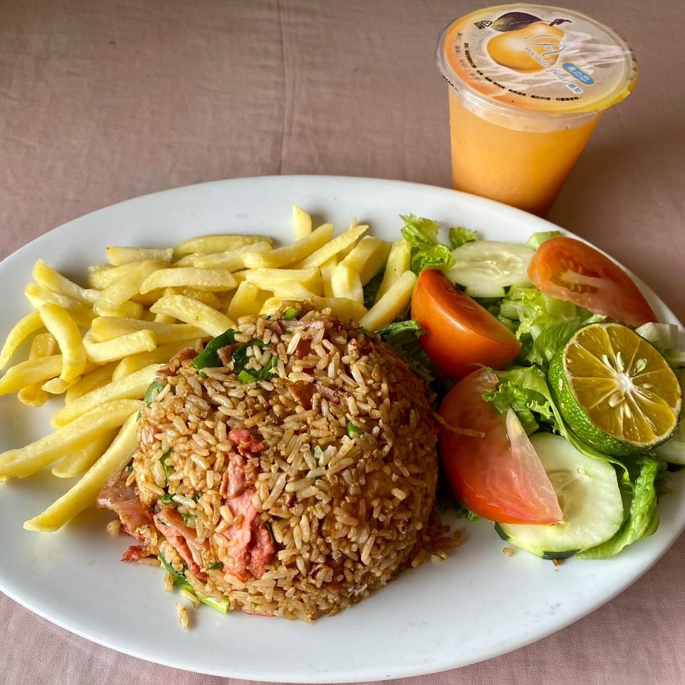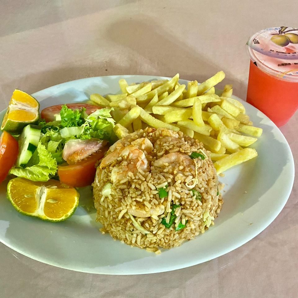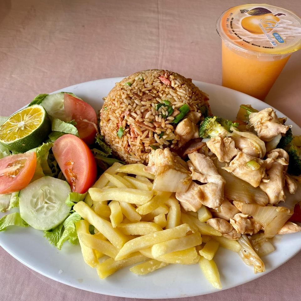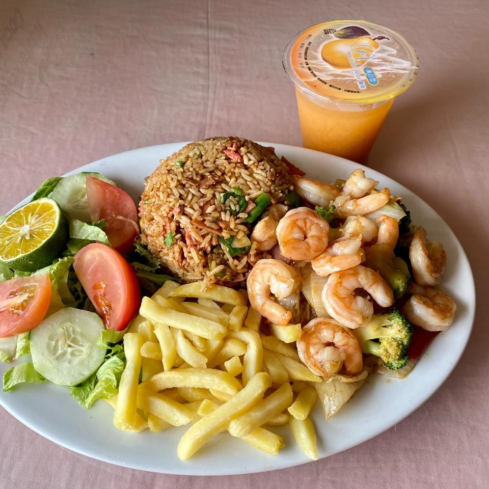 Arroz frito con camarón y papas ensalada incluso refresco natural 12 onzas