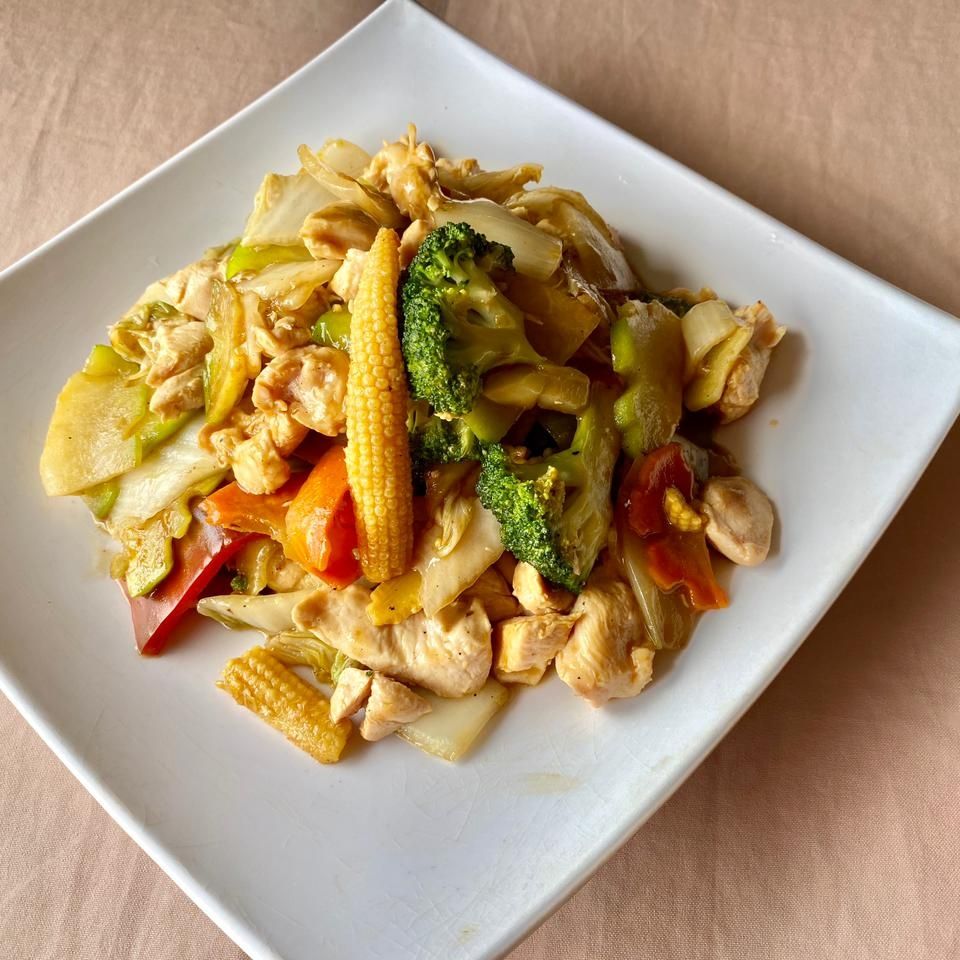 Pollo en Trocitos con Verduras en Salsa de Ostión