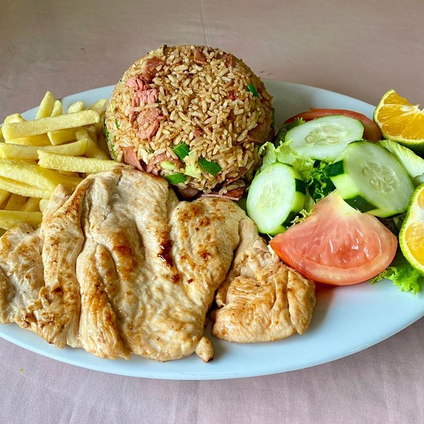 Arroz cantones or arroz banco con papas ensalada y pechuga pollo incluso refresco natural 12 onzas