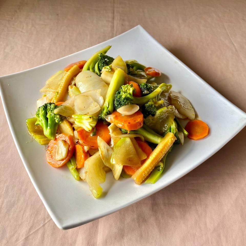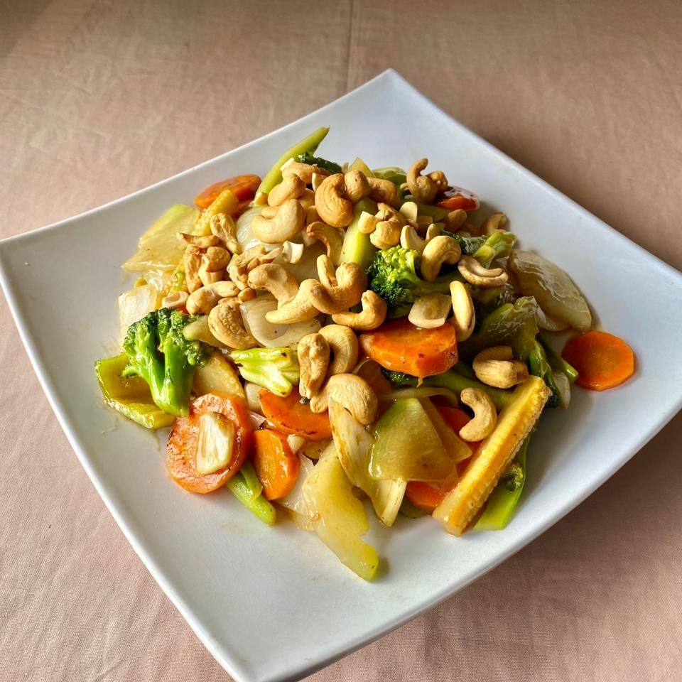 Brócoli mostaza china zanahoria chayote champiñones bambú elote tierno en semilla Marañón