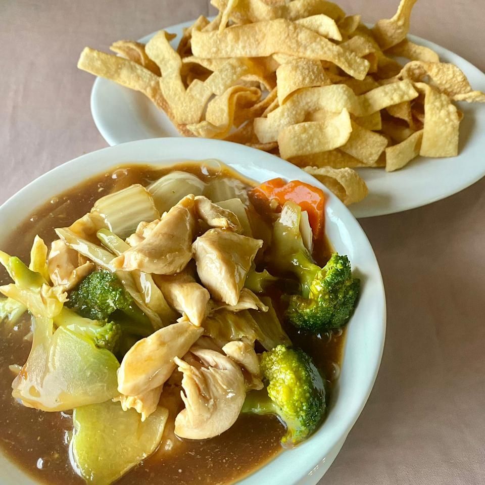 Arroz cantones or arroz banco y Pollo or carne de res con verduras en salsa ostión y papas ensalada incluso refresco natural 12 onzas