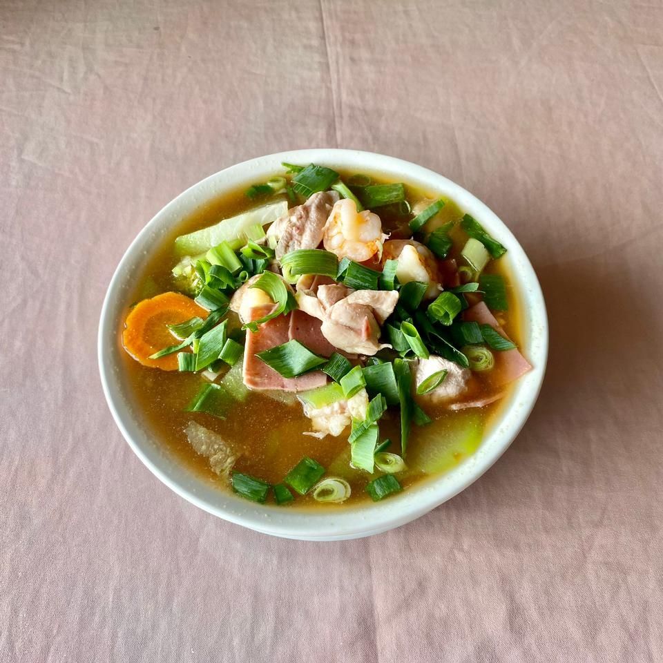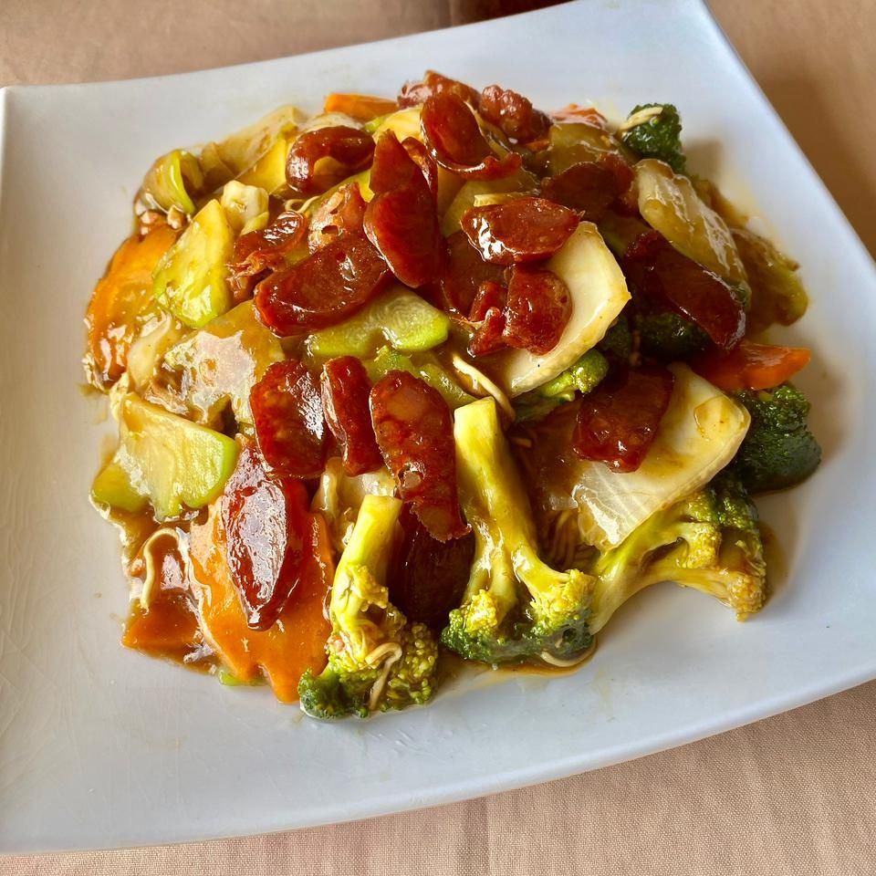 Pollo jamón lechón carne de res camarón y chorizo chino con verduras en salsa ostión