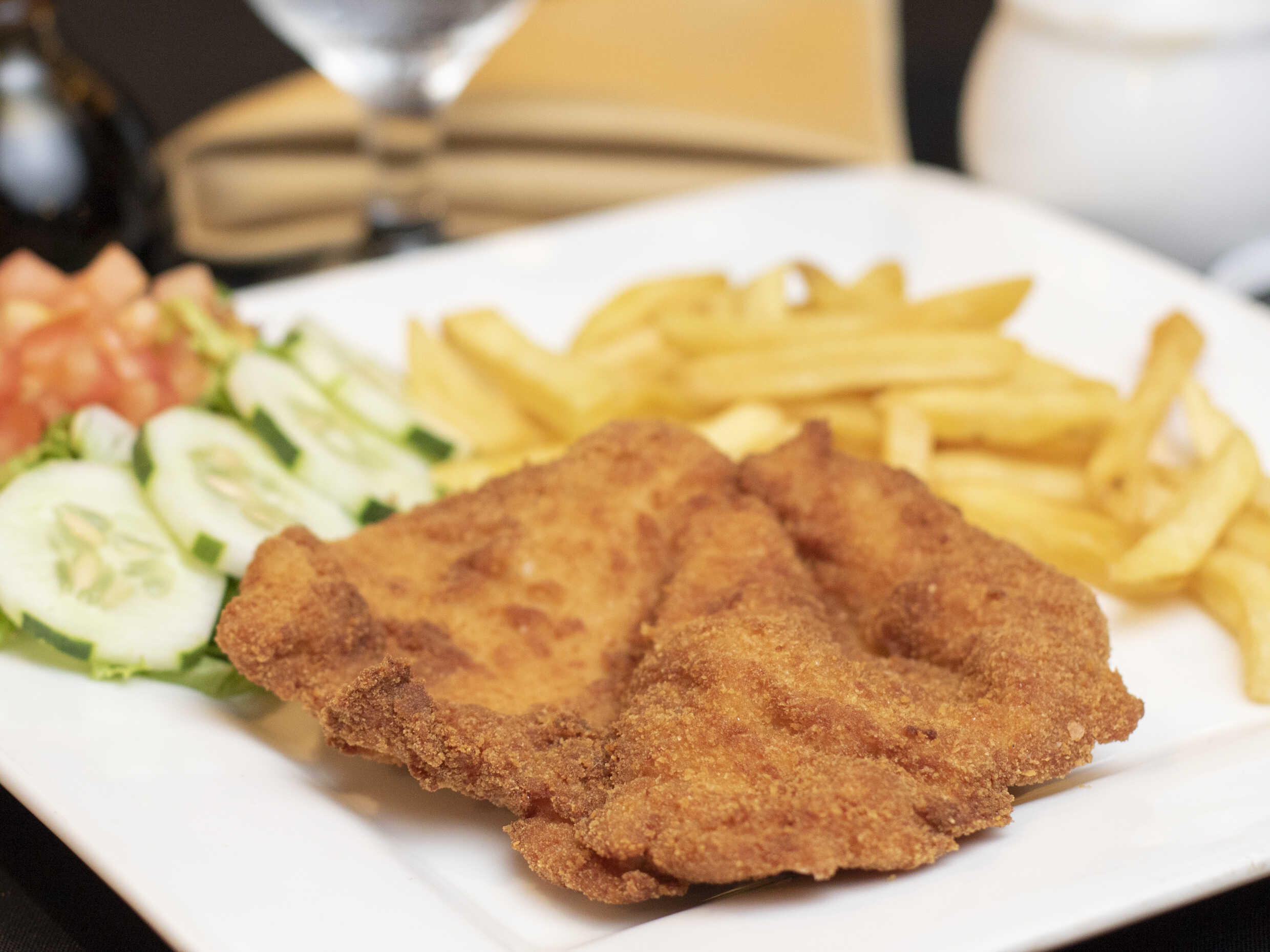Fajitas de pechuga de pollo empanizado con ensalada verde: pepino, tomate, lechuga y papas.
