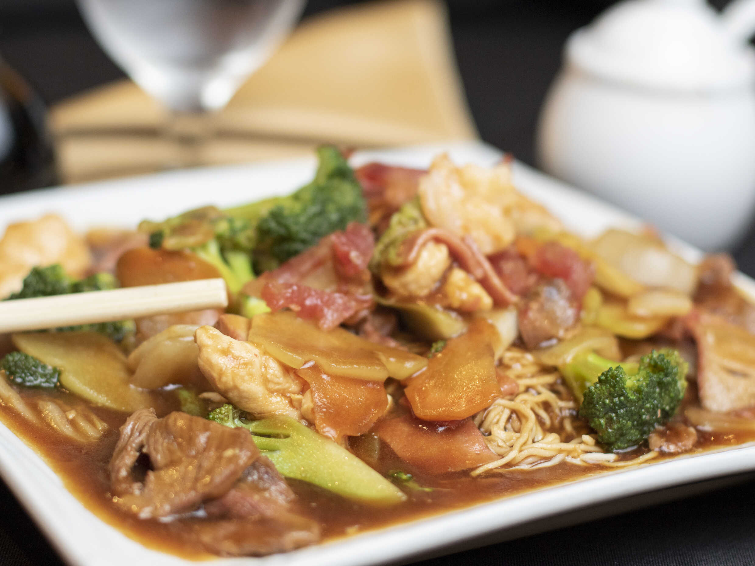 Arroz tostado, jamón, chorizos chinos, lechón, pollo, res, camarón, cebolla, apio, verduras y bambú en salsa de ostión.