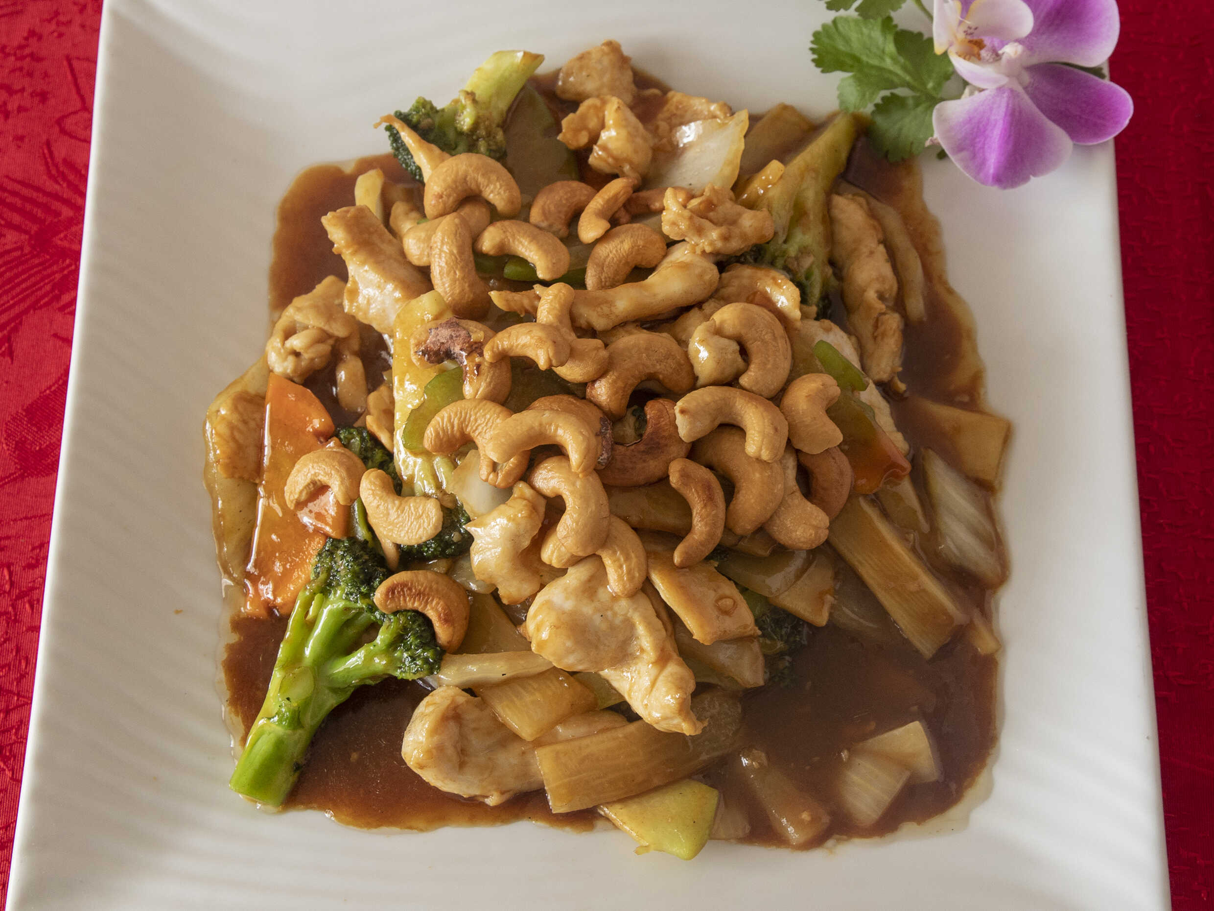 Trozos de pollo, cebolla, apio, verduras, bambú y semilla de marañones en salsa de ostión.