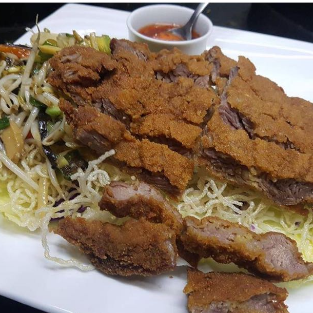 Camarones empanizados, arroz cantonés, chop suey en salsa y wan tan frito con salsa agridulce.