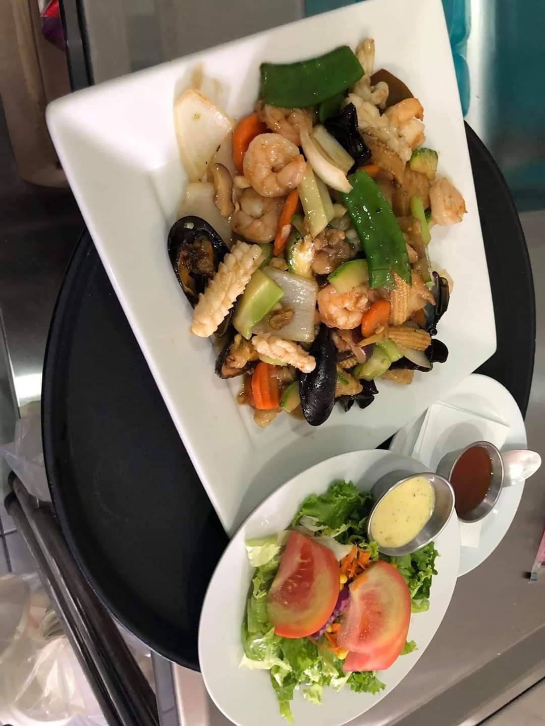 Camarones, cebollin y jengibre en salsa especial, acompañado con vegetales mixtos