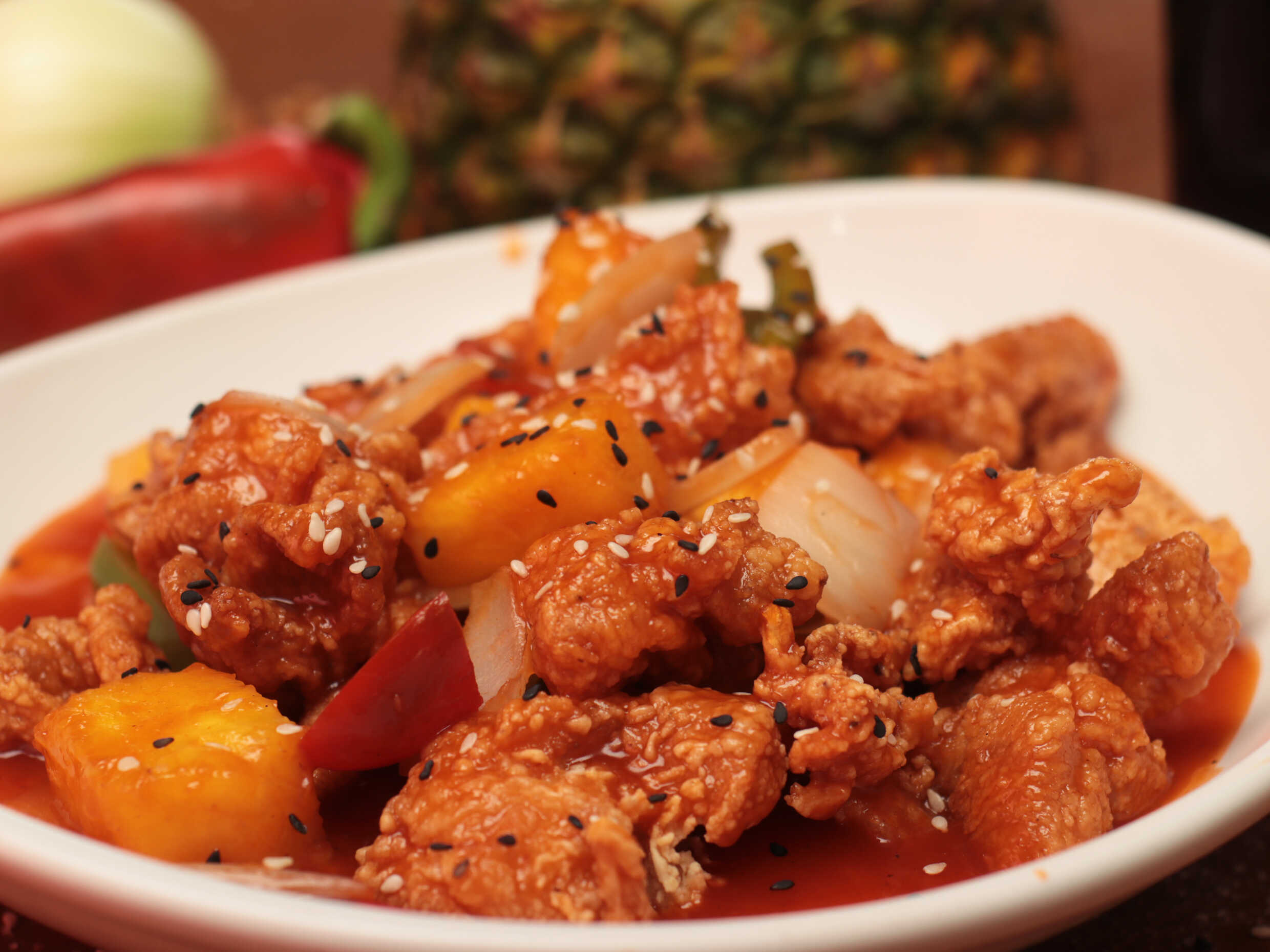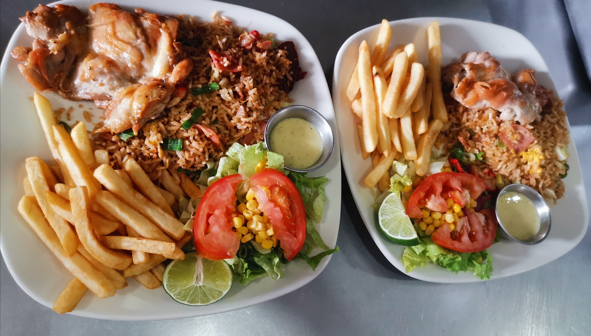 Pollo, vegetales en salsa especial, acompañado con arroz tostado, servido en plato de hierro caliente.