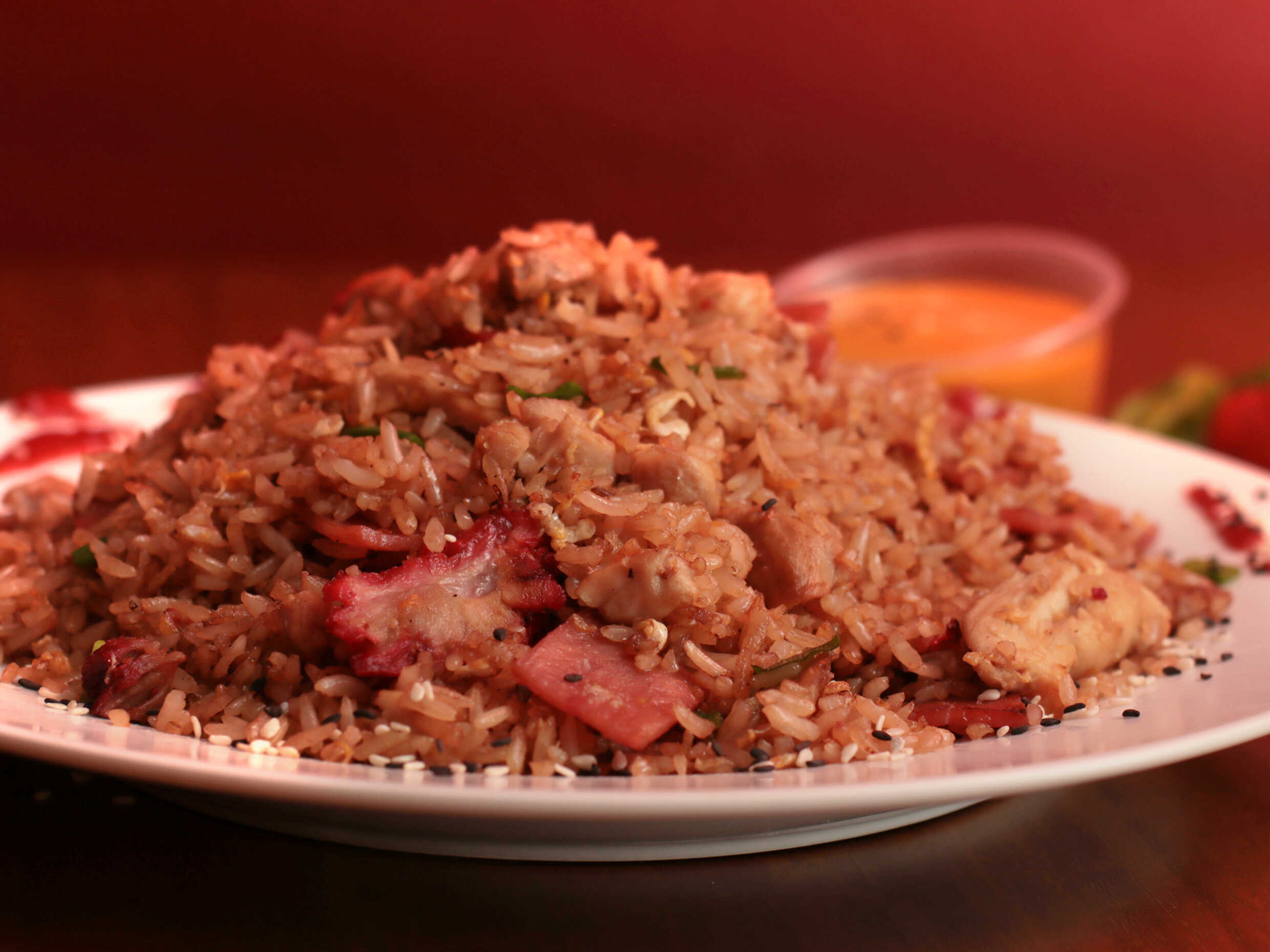 En salsa o seco, contiene lechón, jamón, pollo, camarón, chorizo chino y vegetales.