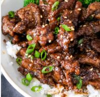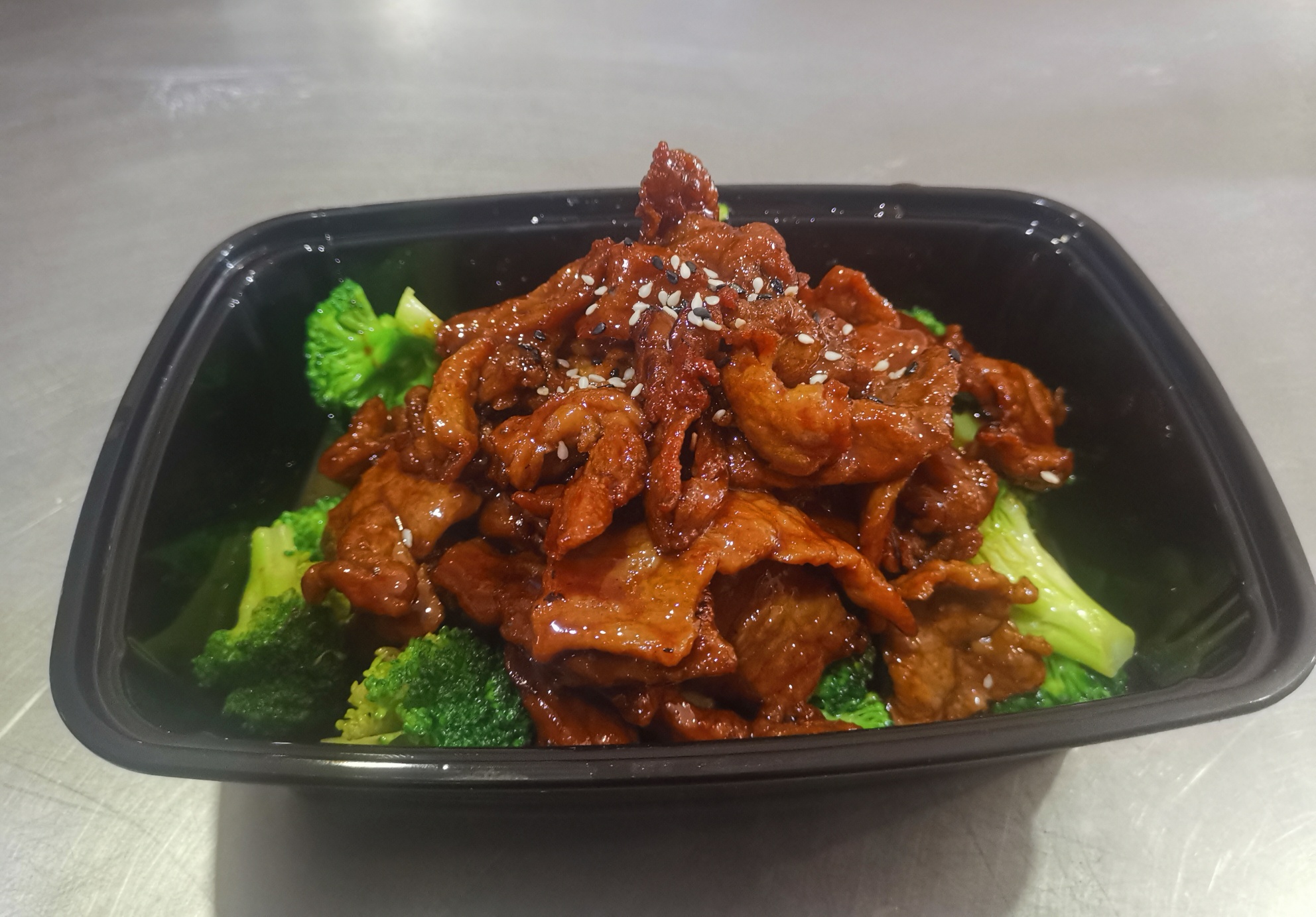 Carne de res, vegetales en salsa, acompañado con arroz tostado, servido en plato de hierro caliente.