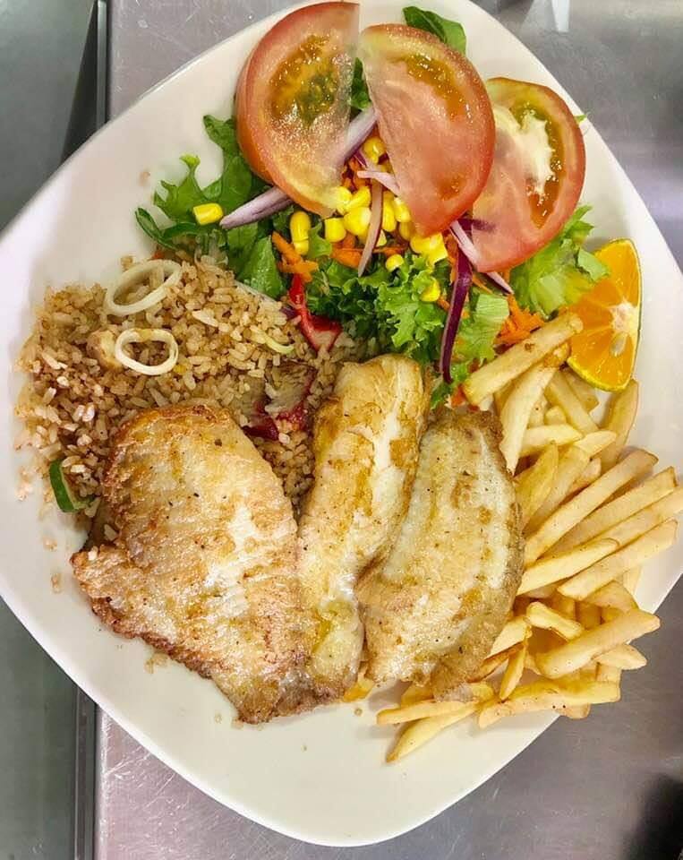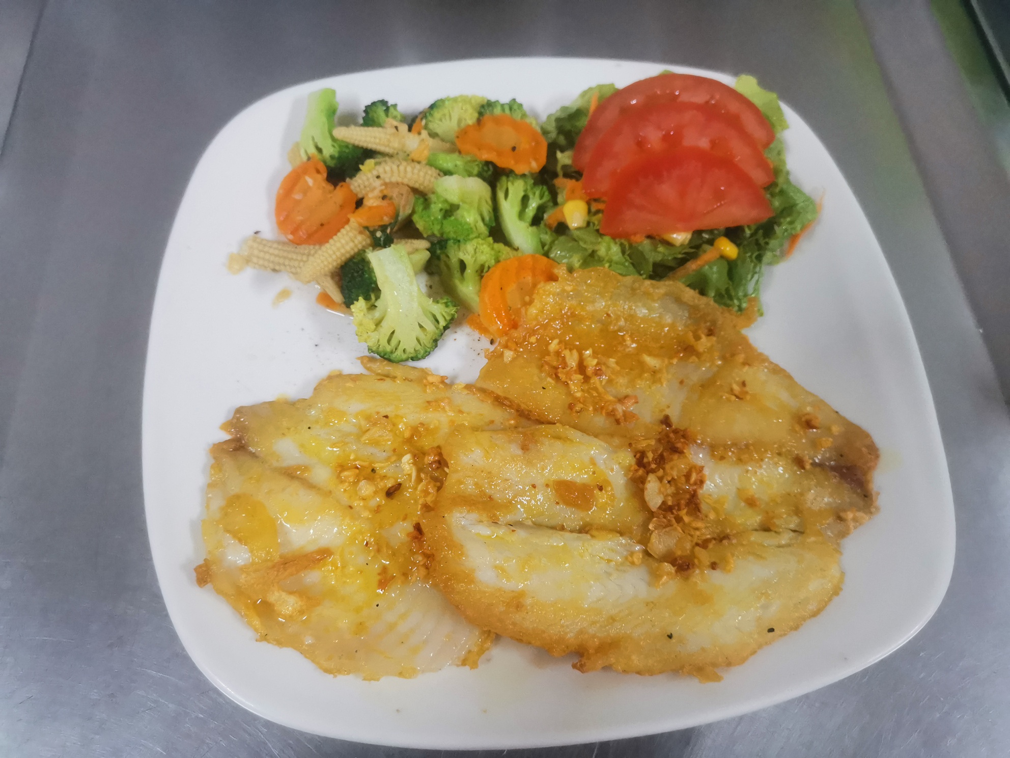 Filete de pescado al vapor ,cebollino y jengibre en salsa especial acompañado con vegetales mixtos