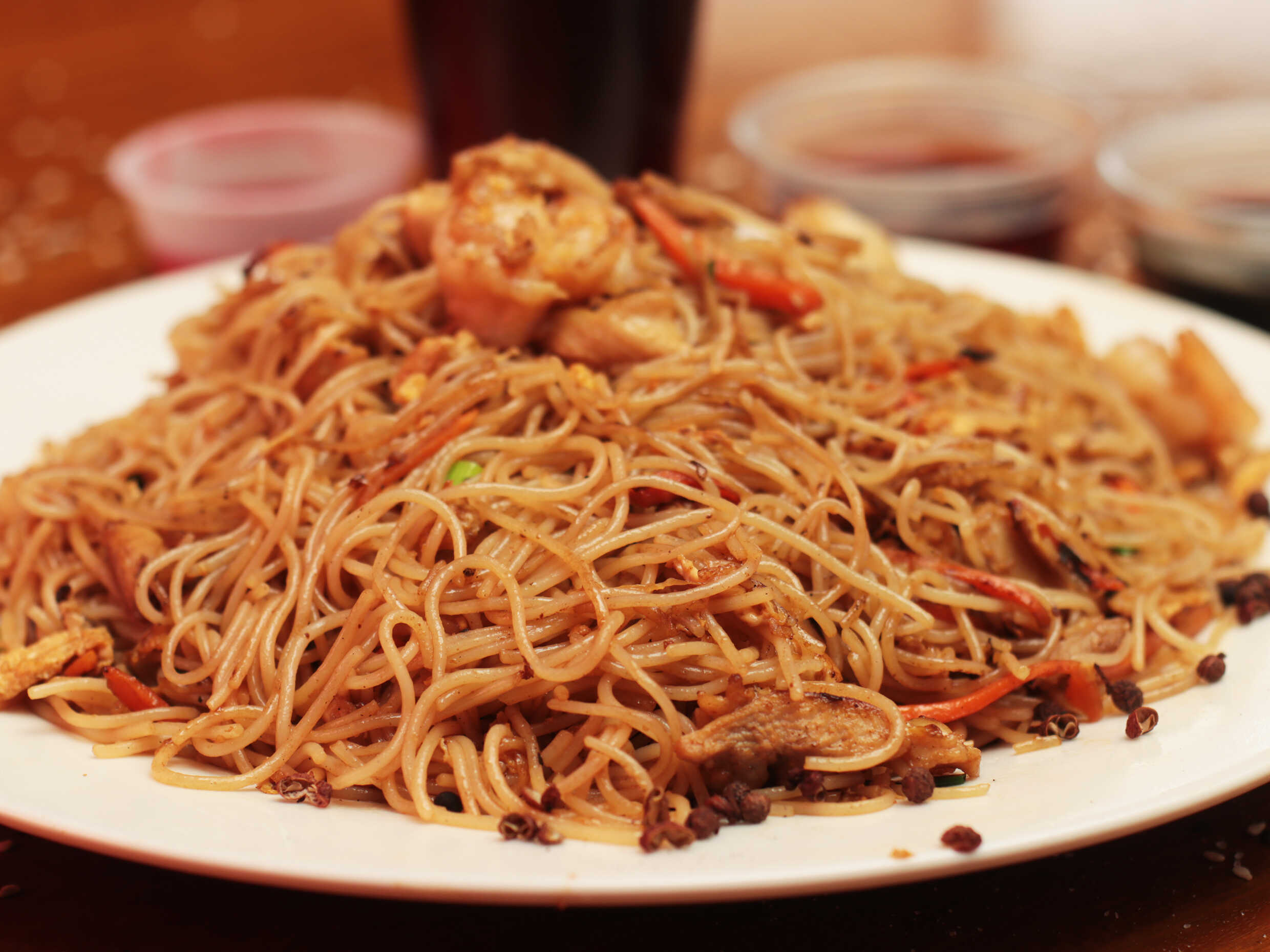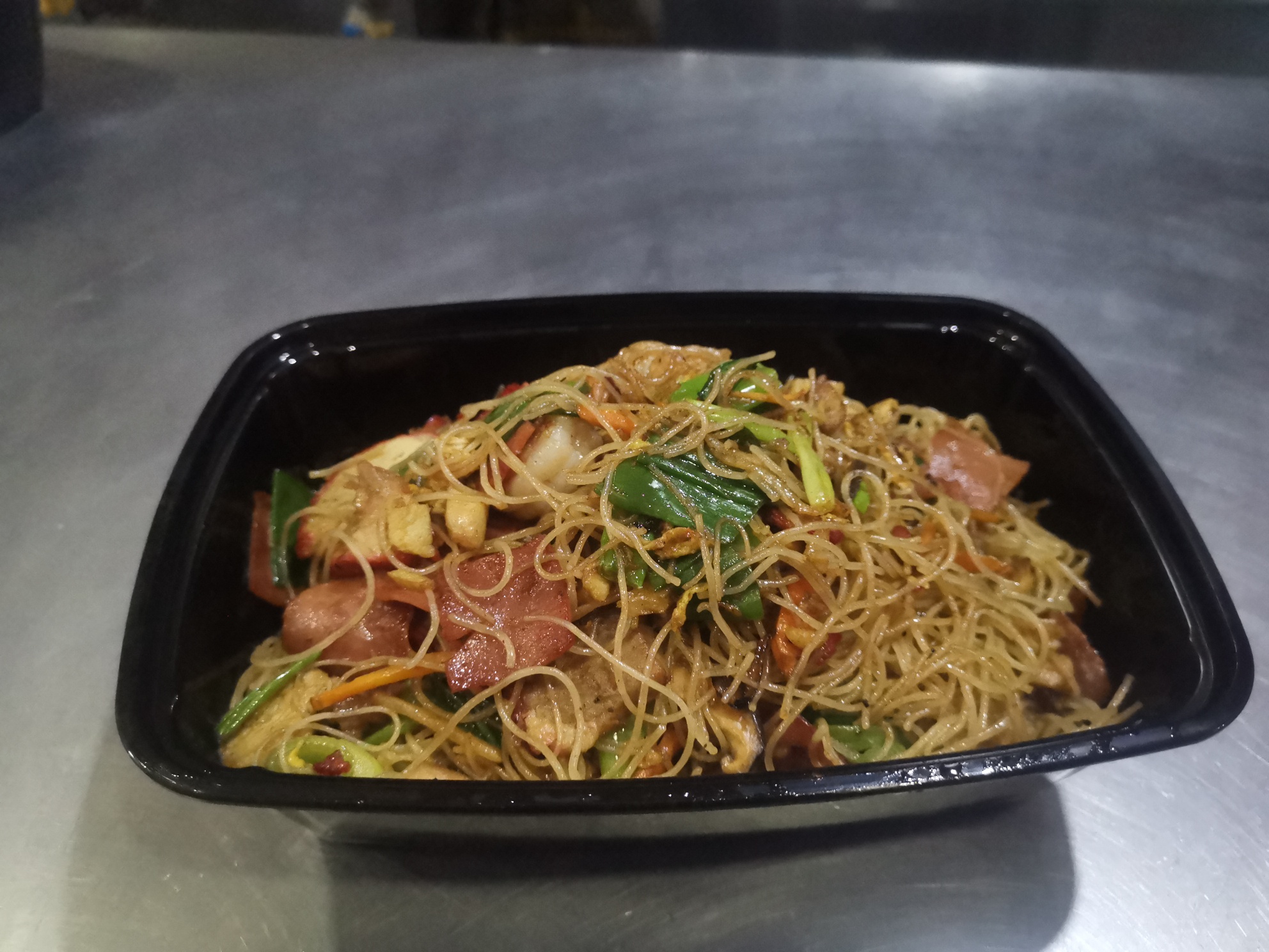 Pasta de arroz delgado, lechón, jamón, pollo, camarón, chorizo chino y vegetal.