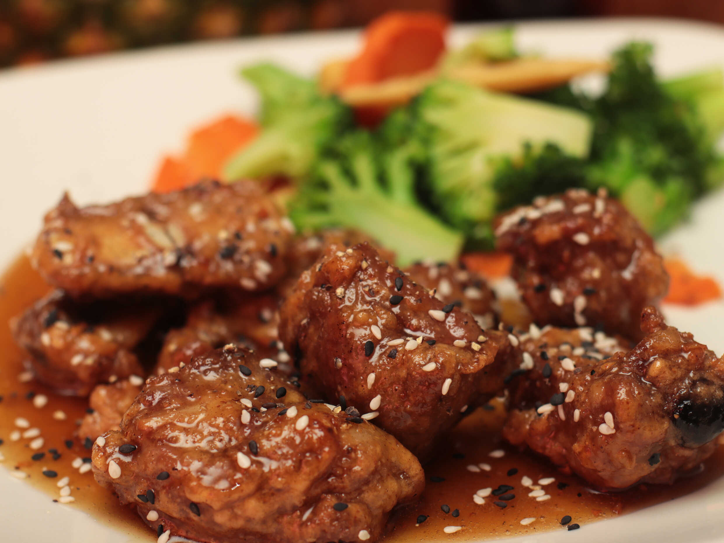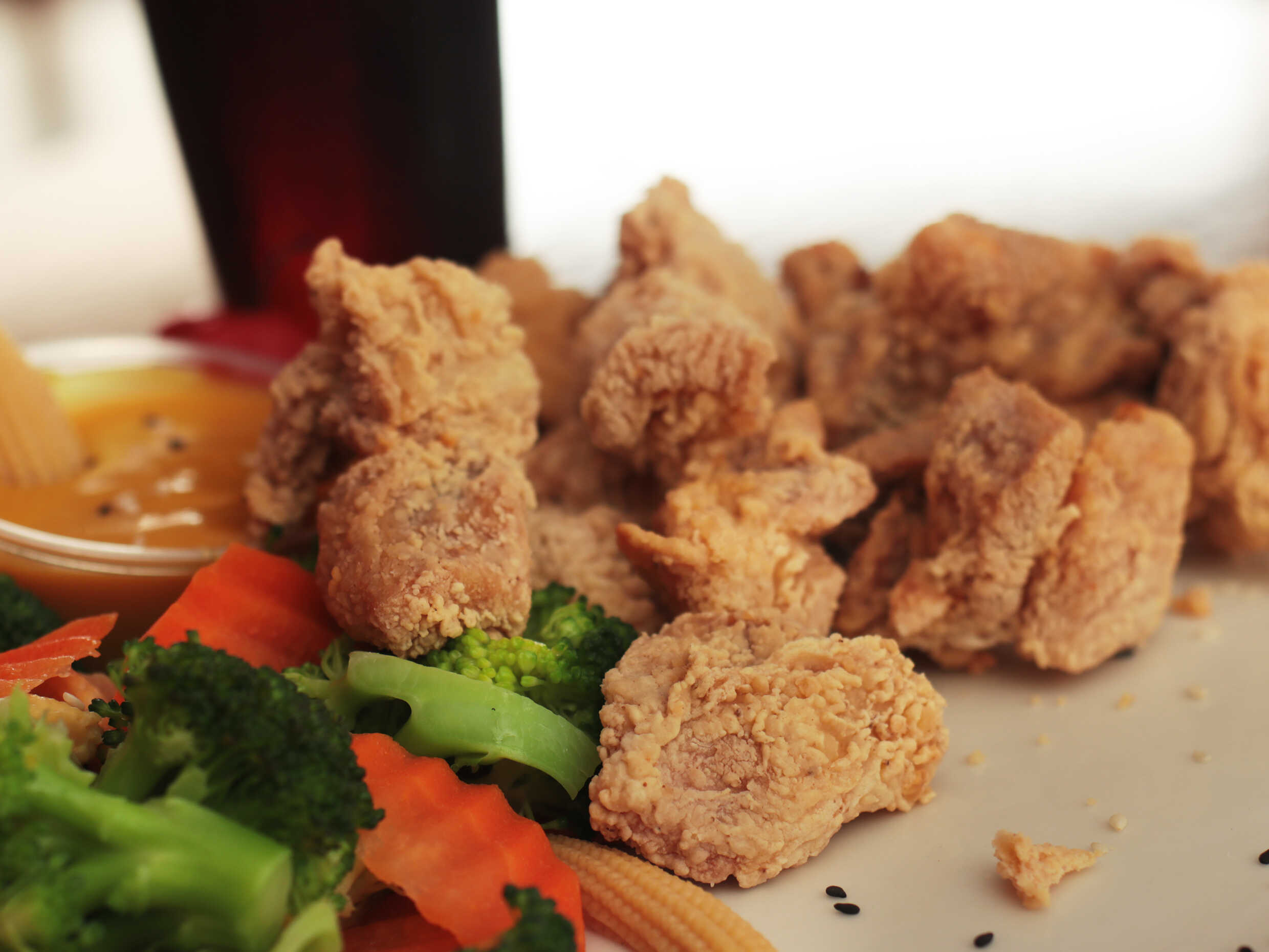 nuggets de pollo acompañado con vegetales mixtos bañado en salsa miel y pimienta negra