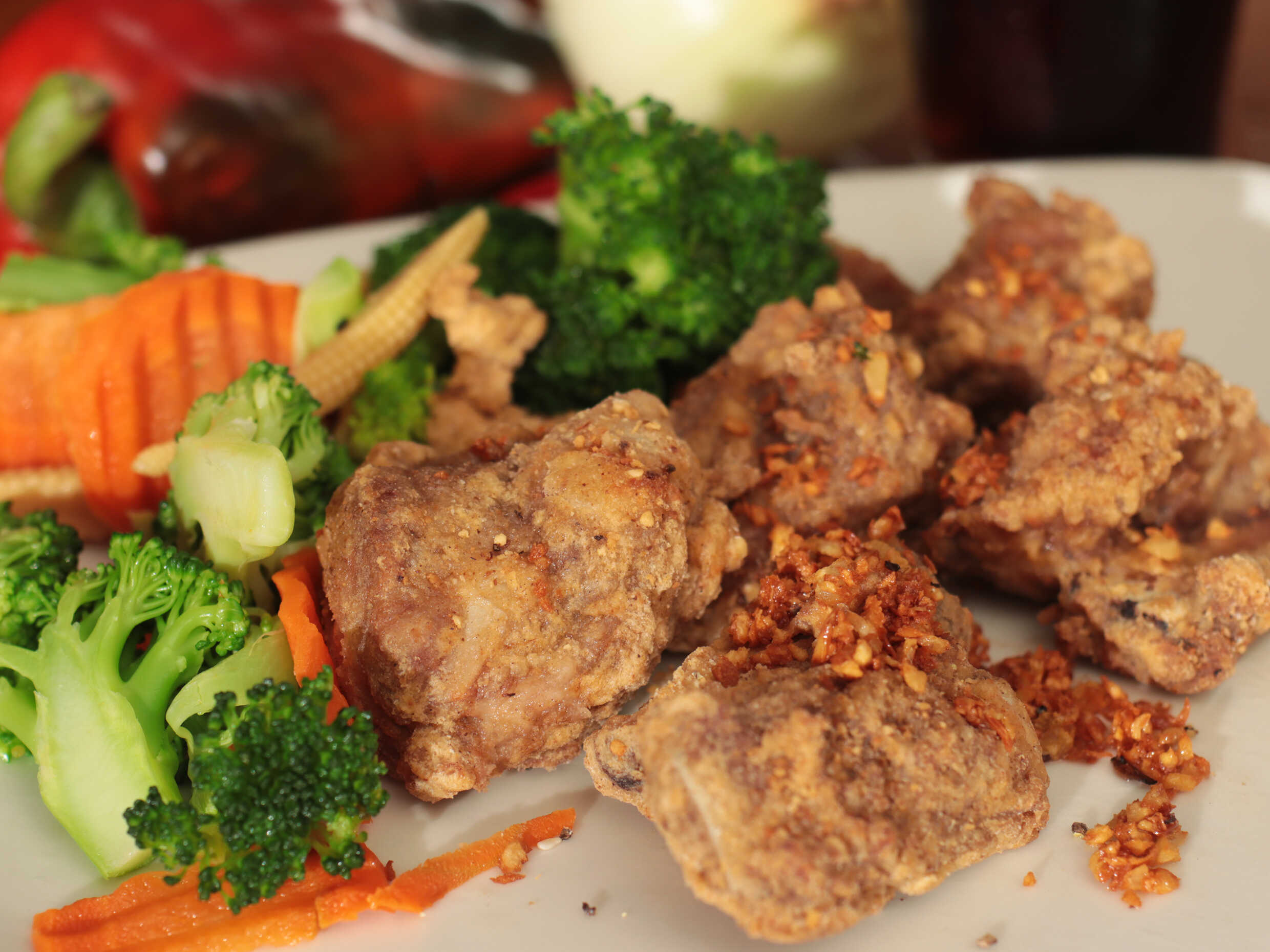 costillade cerdo al ajillo ,acompañado con vegetales mixtos