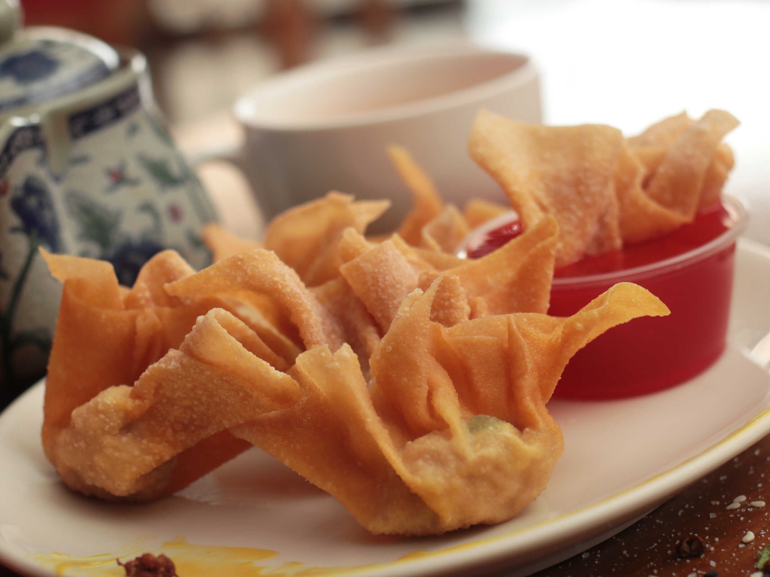 Contiene camarón y vegetales acompañado con tiras de wantán.