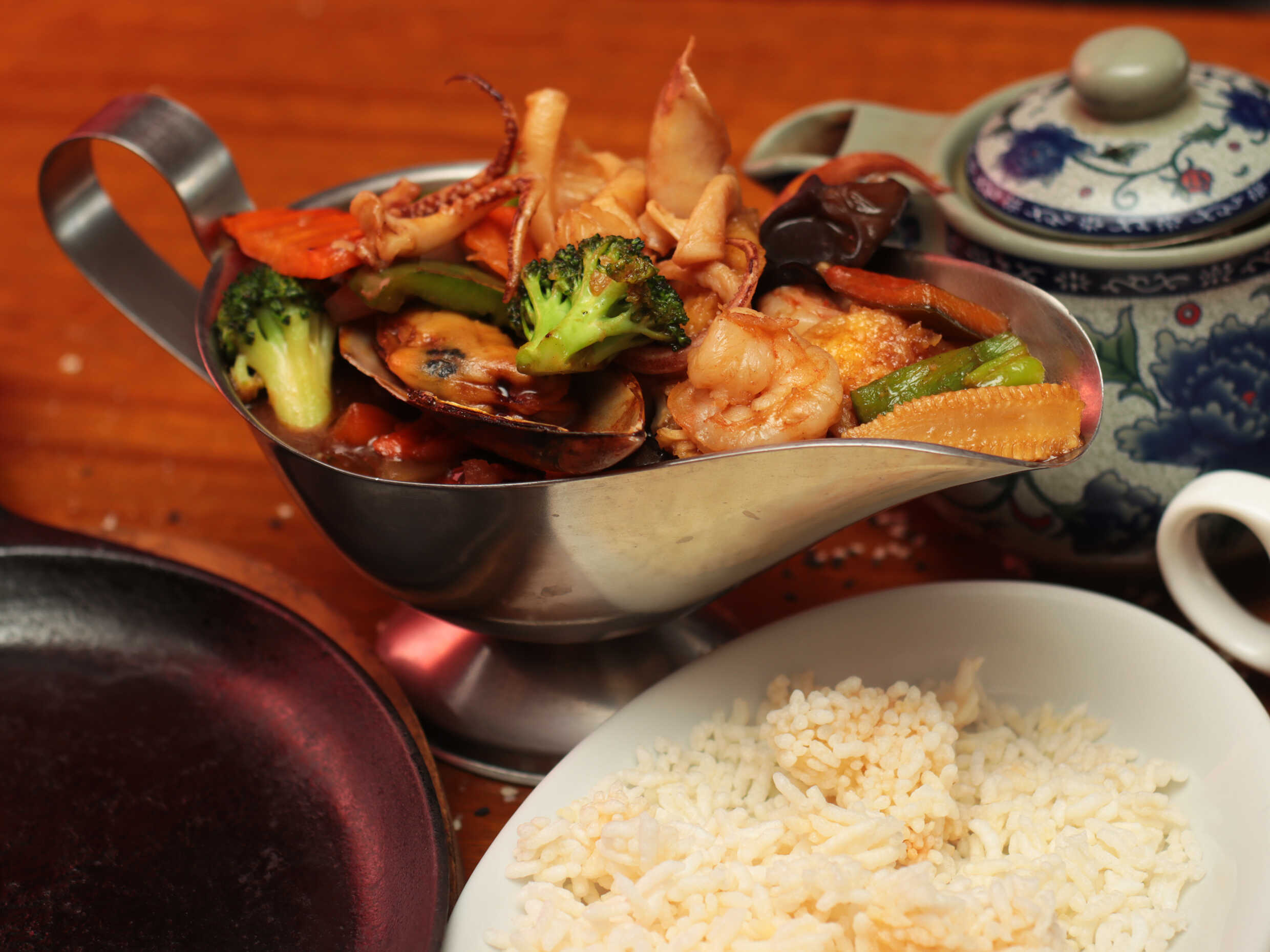 Camarón, vegetales en salsa especial, acompañado con arroz tostado, servido en plato de hierro caliente.