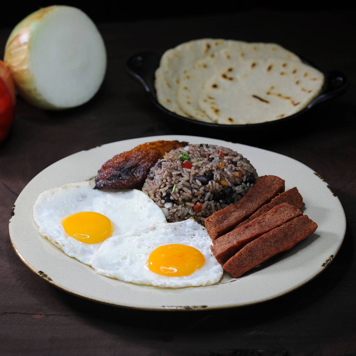 Arroz, Frijoles, Pollo a la plancha, ensalada y maduro.