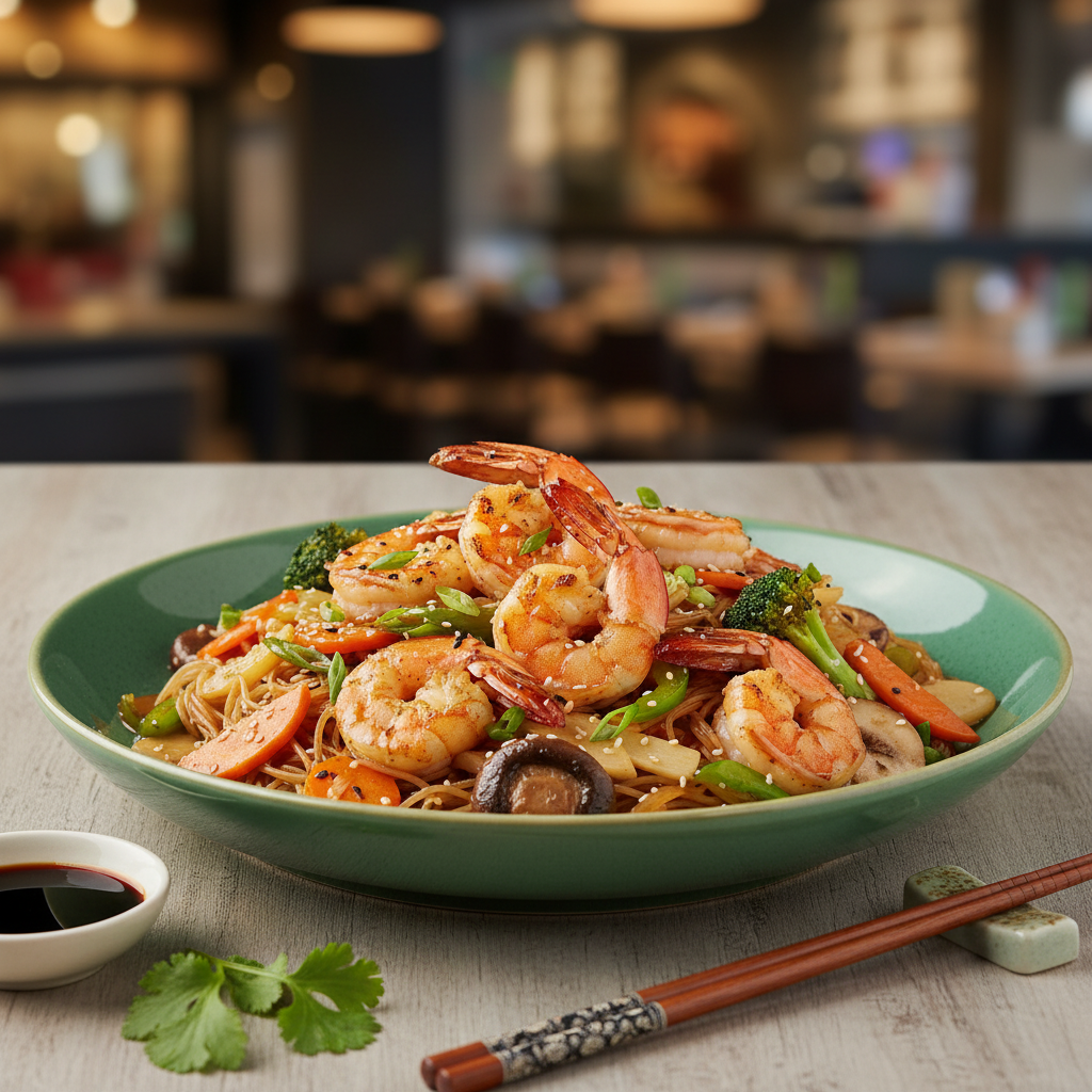 Deliciosa chop suey con camarones y verduras.