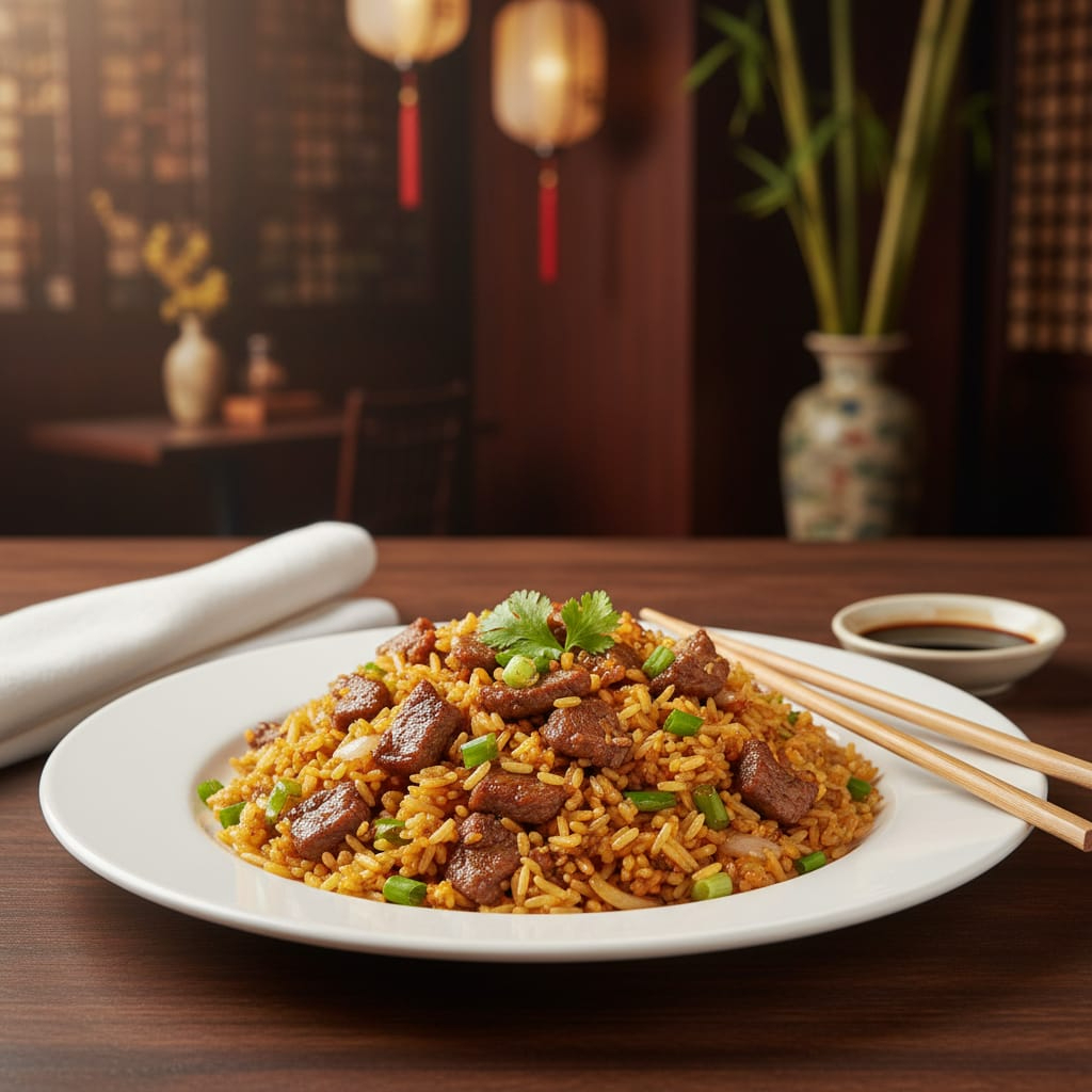 Arroz frito con carne de res.