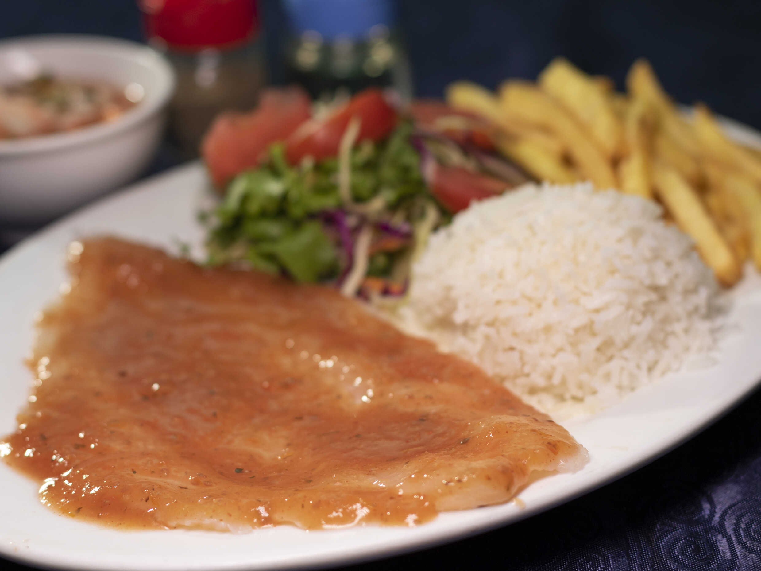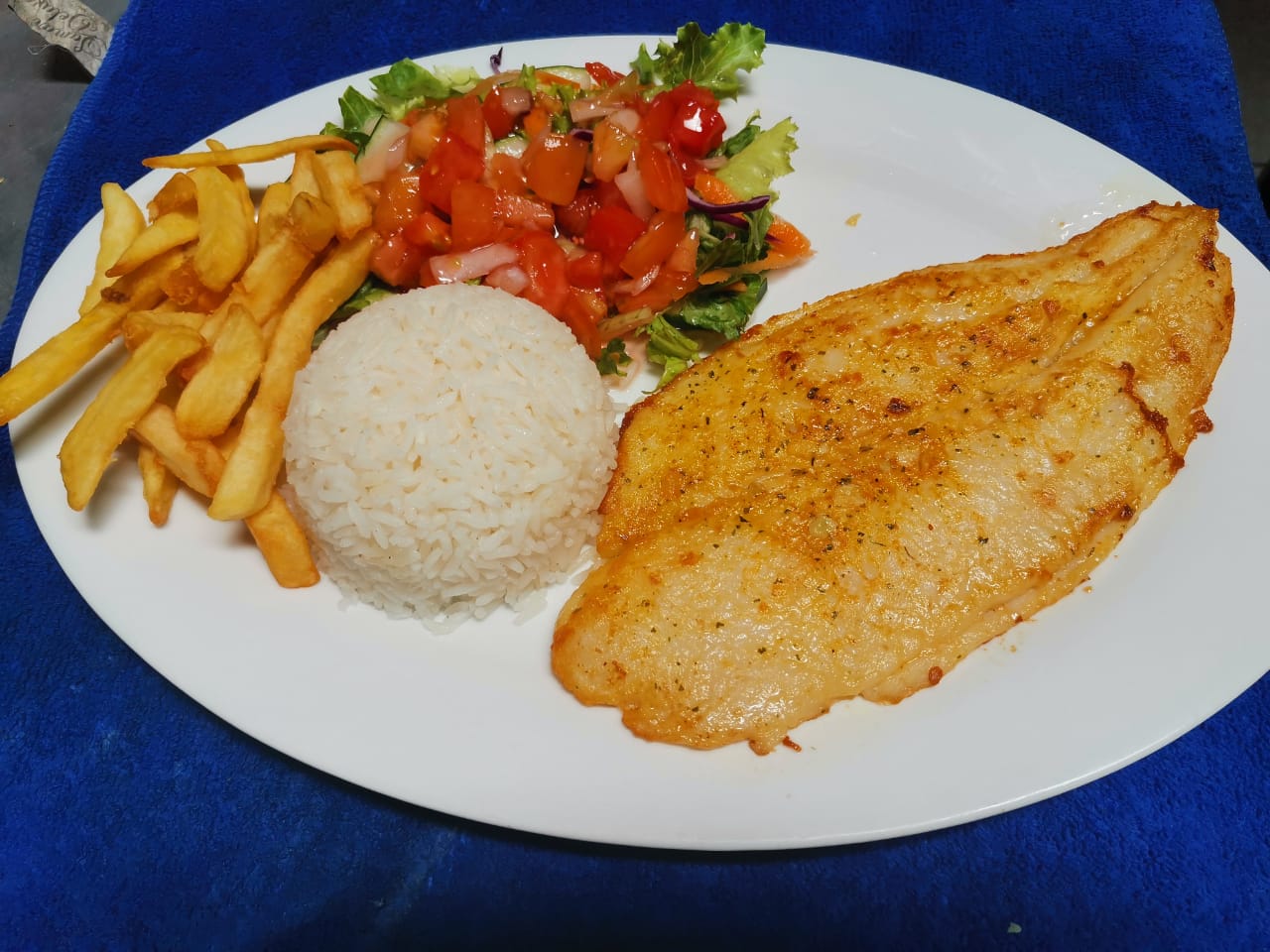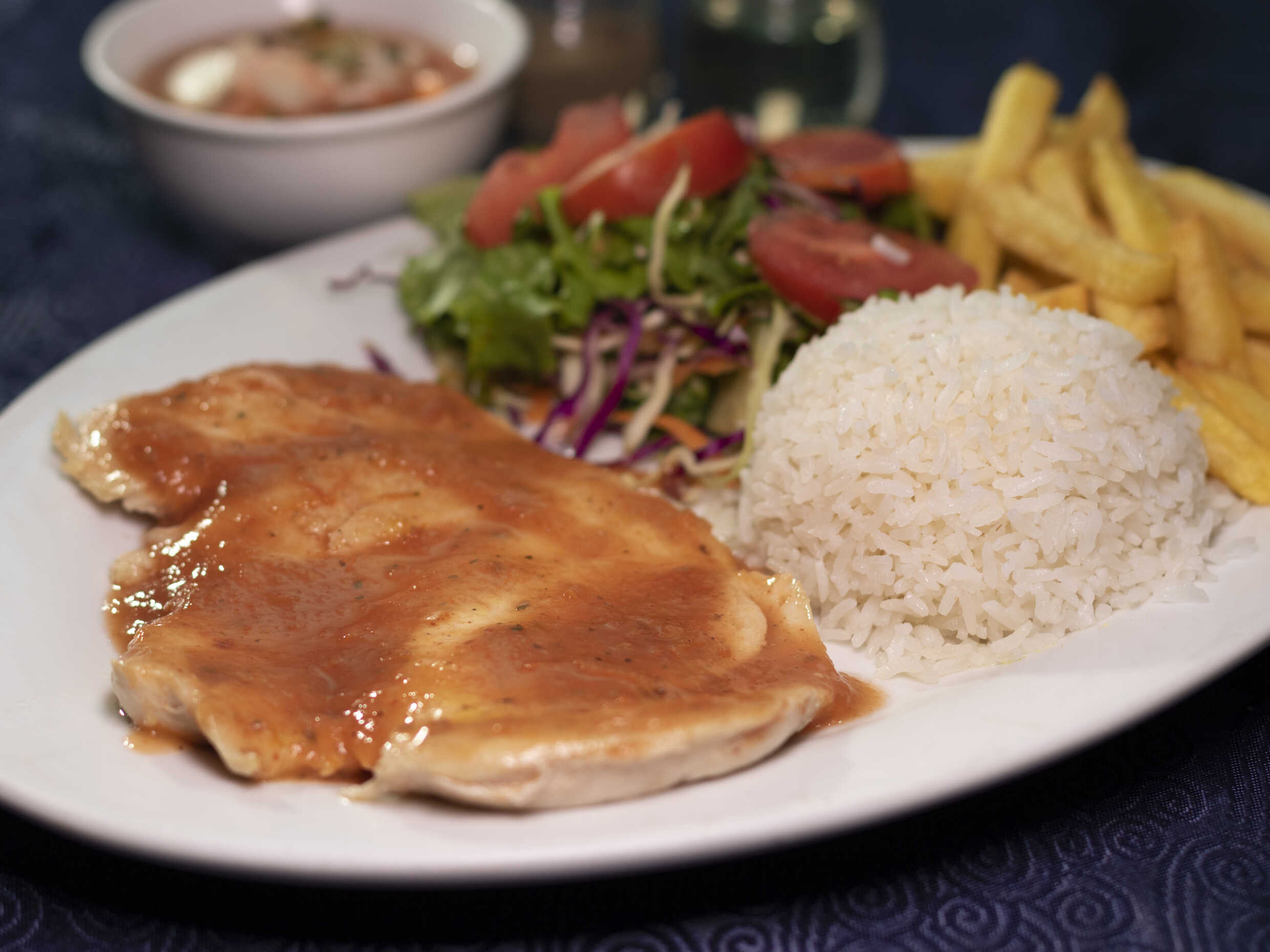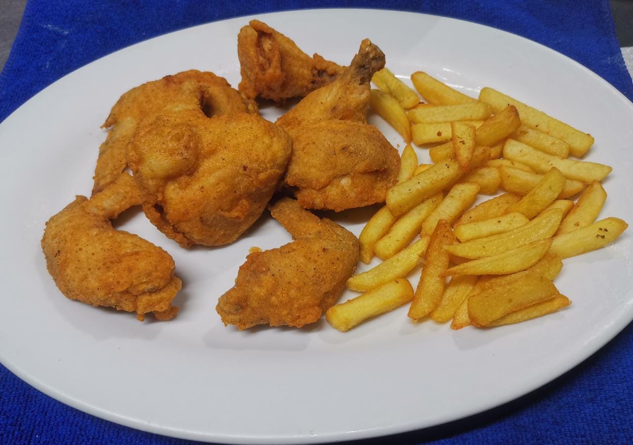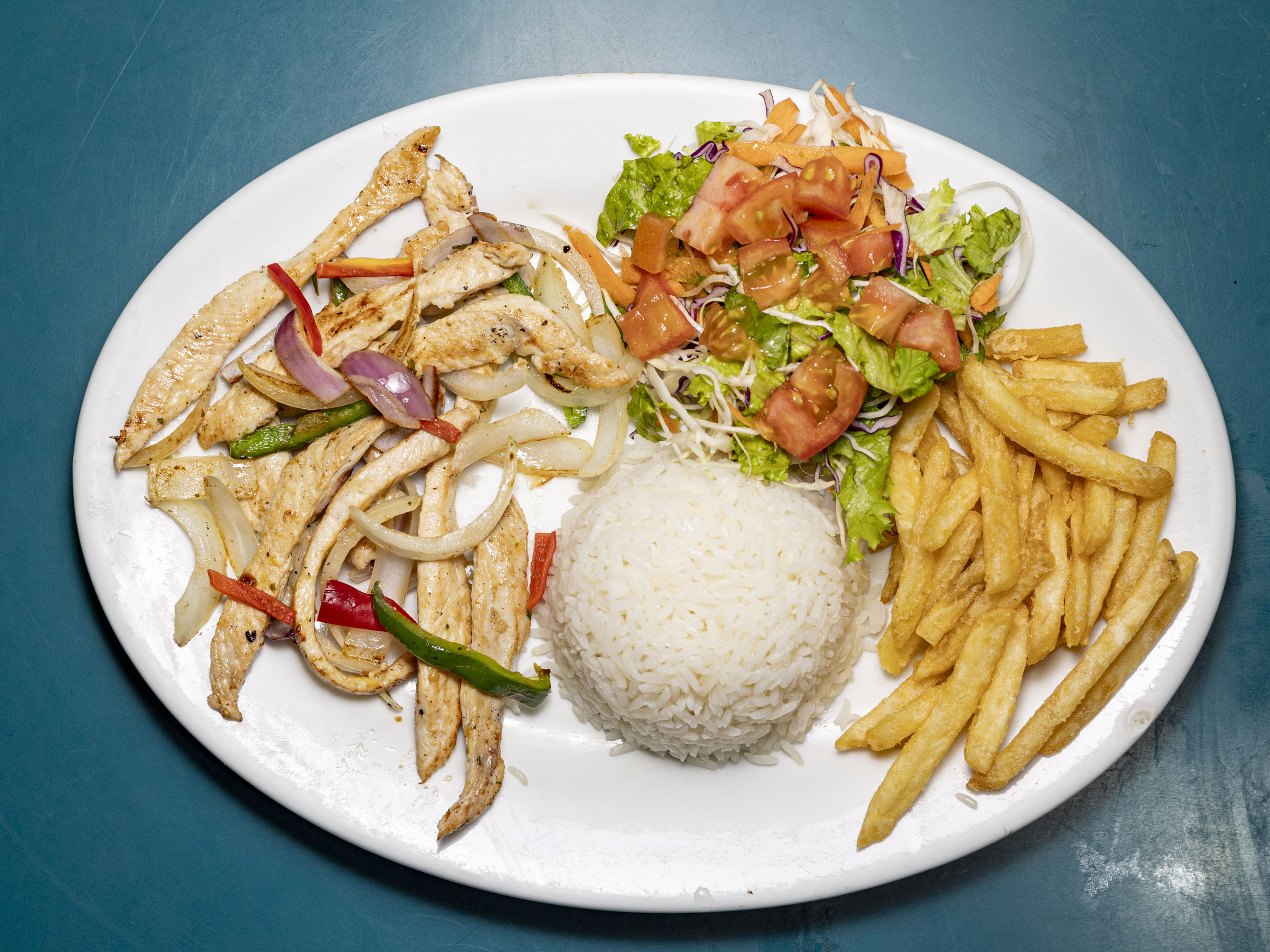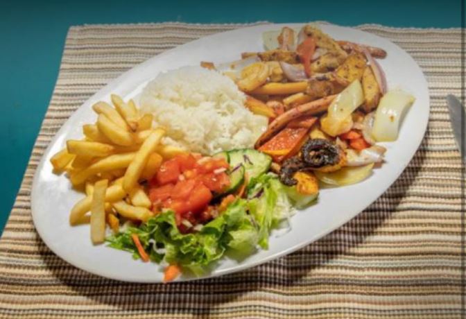 Acompañado con arroz blanco, ensalada y papas.