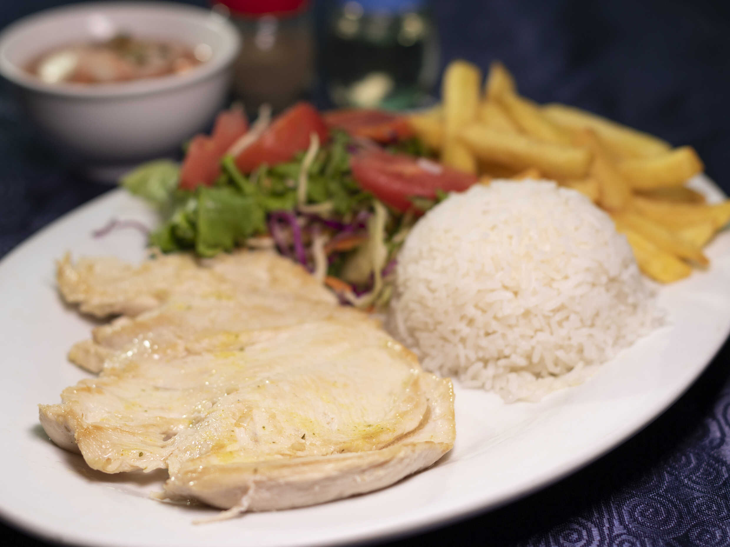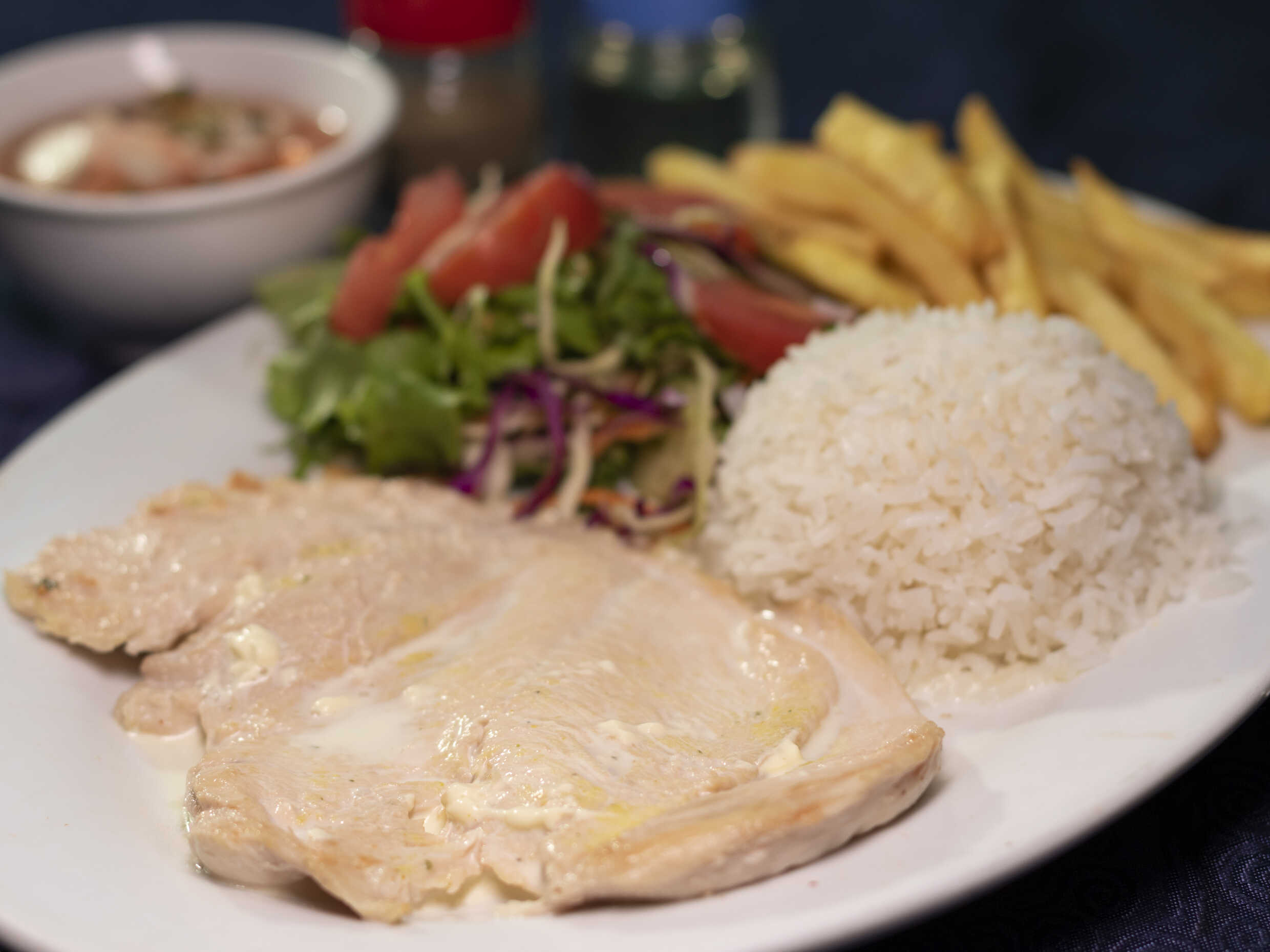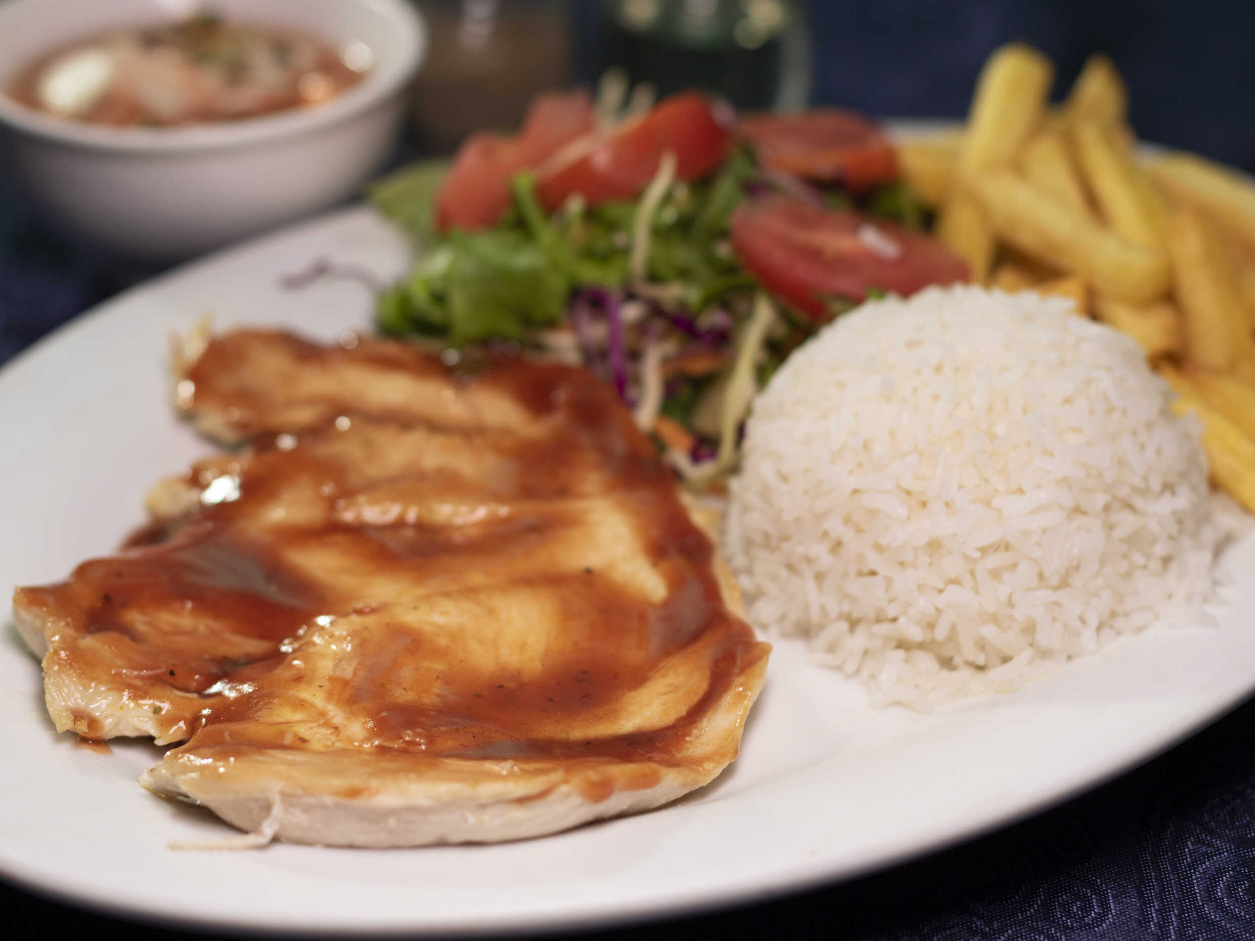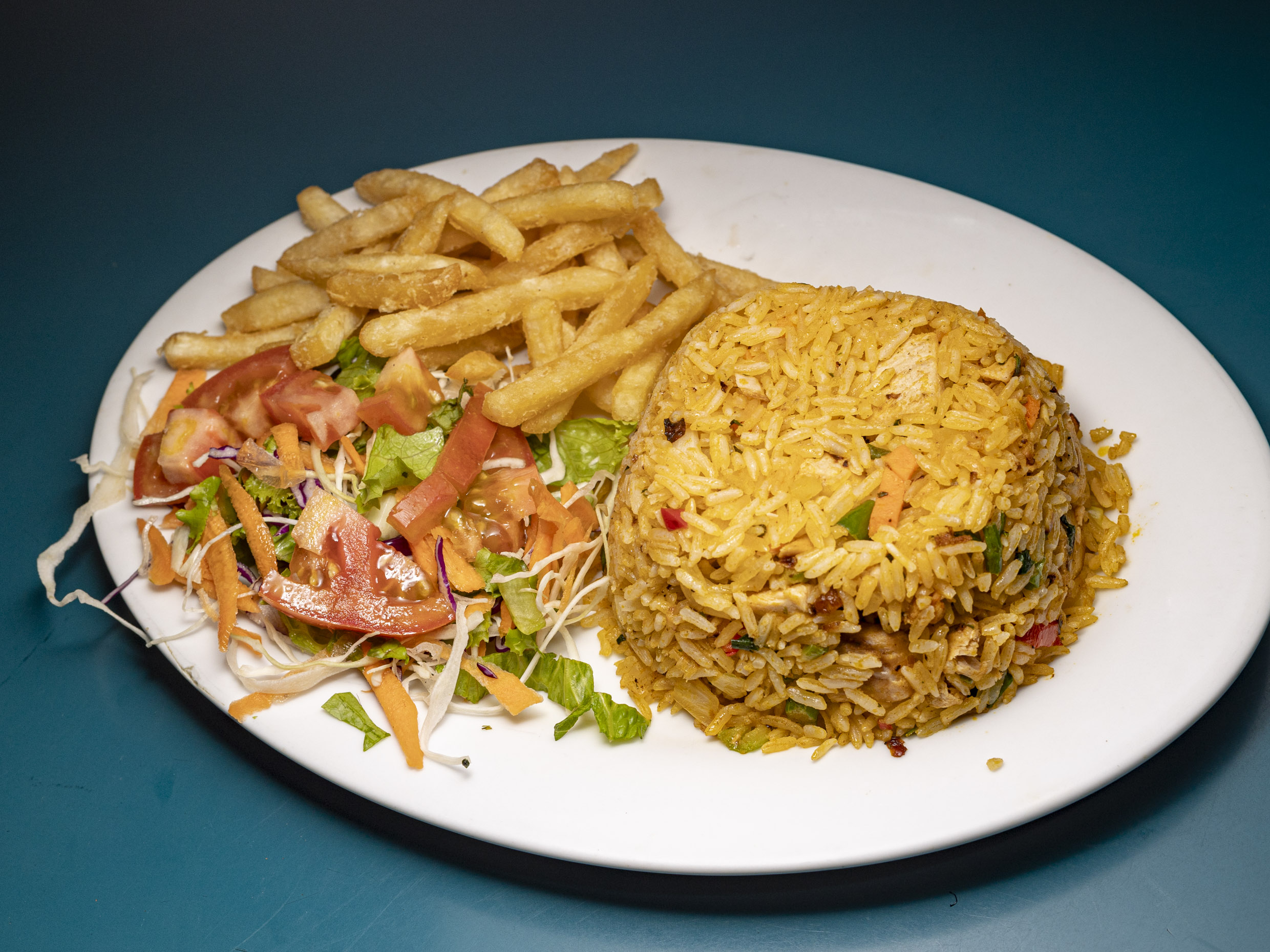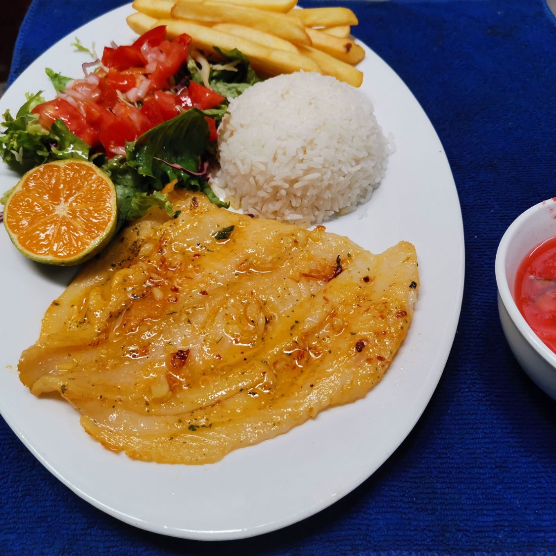 Acompañado con arroz blanco, ensalada y papas.