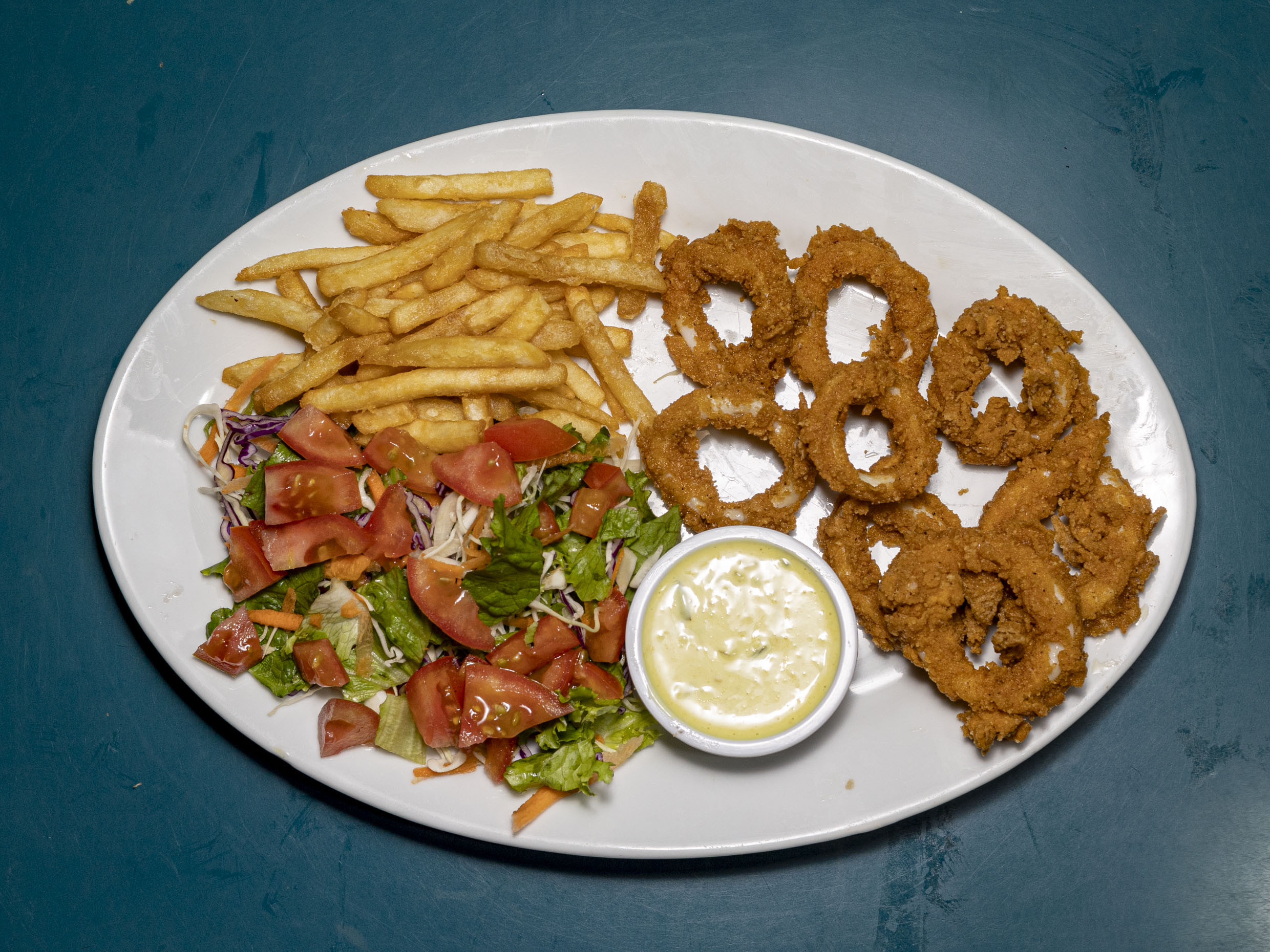 Arroz con camarones (10 camarones), ensalada, papas fritas (20gr), salsas mayonesa y tomate.