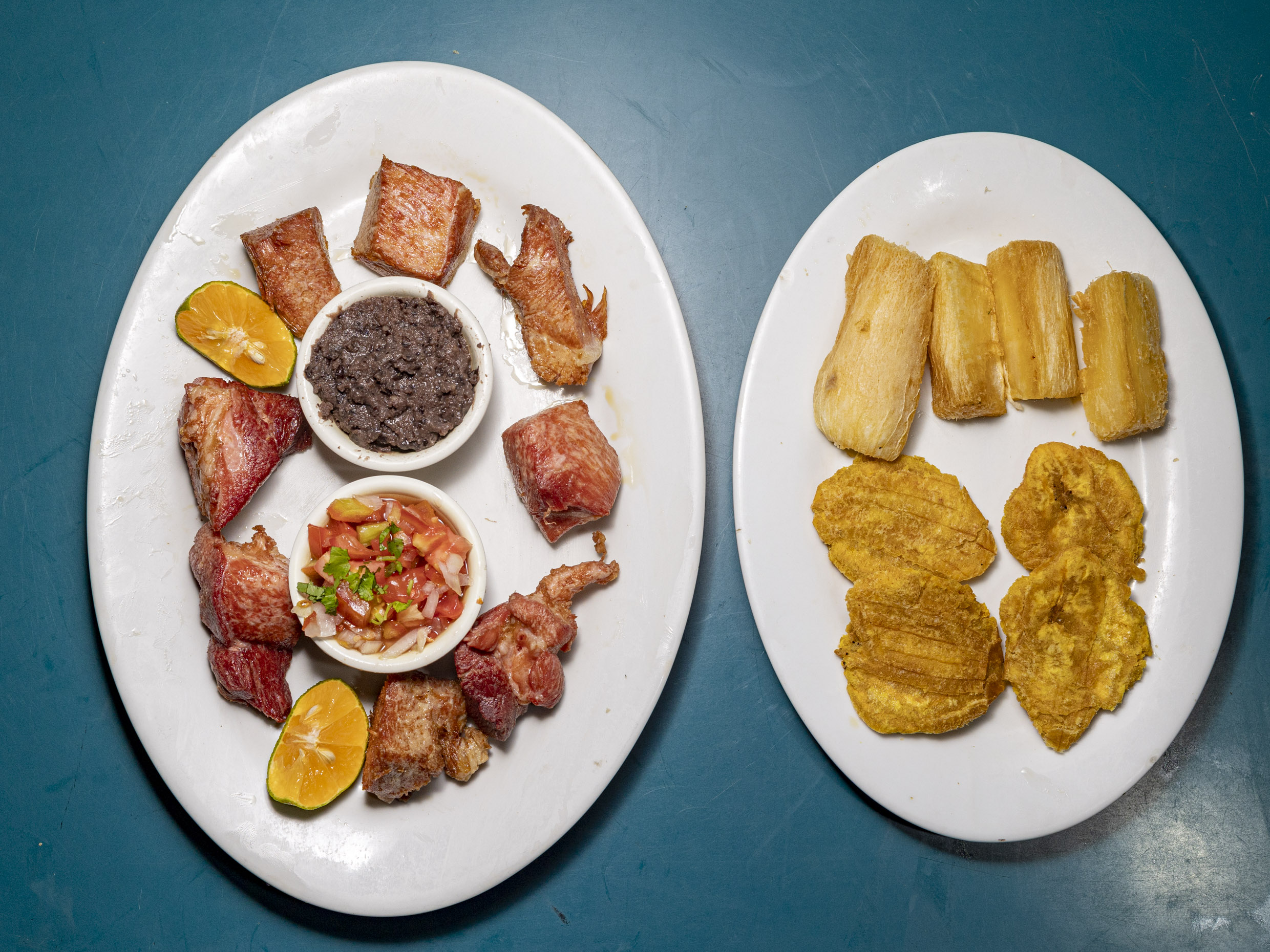 Patacones, yuca, frijoles y pico de gallo.