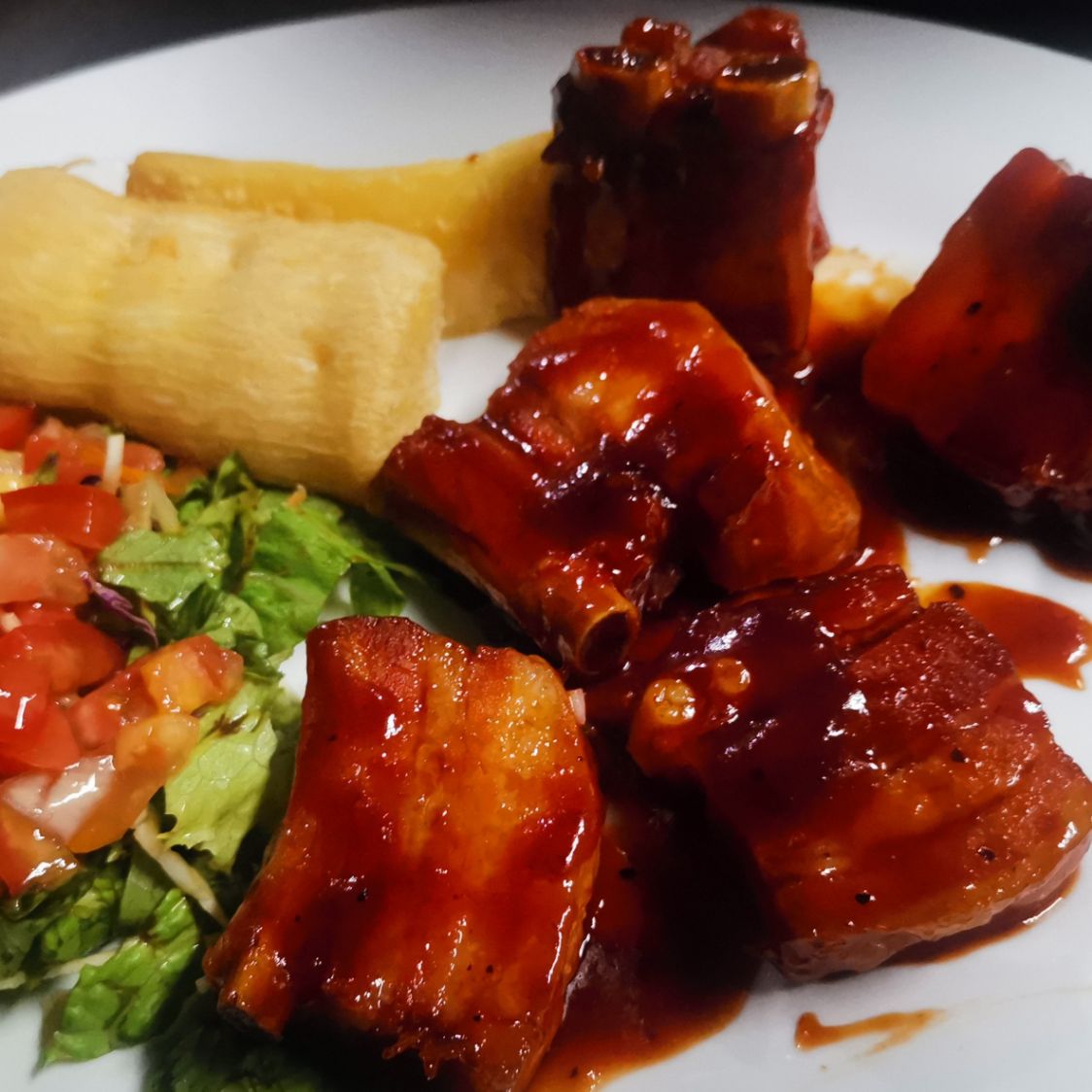 Costilla y chicharrones con yuca y ensalada.