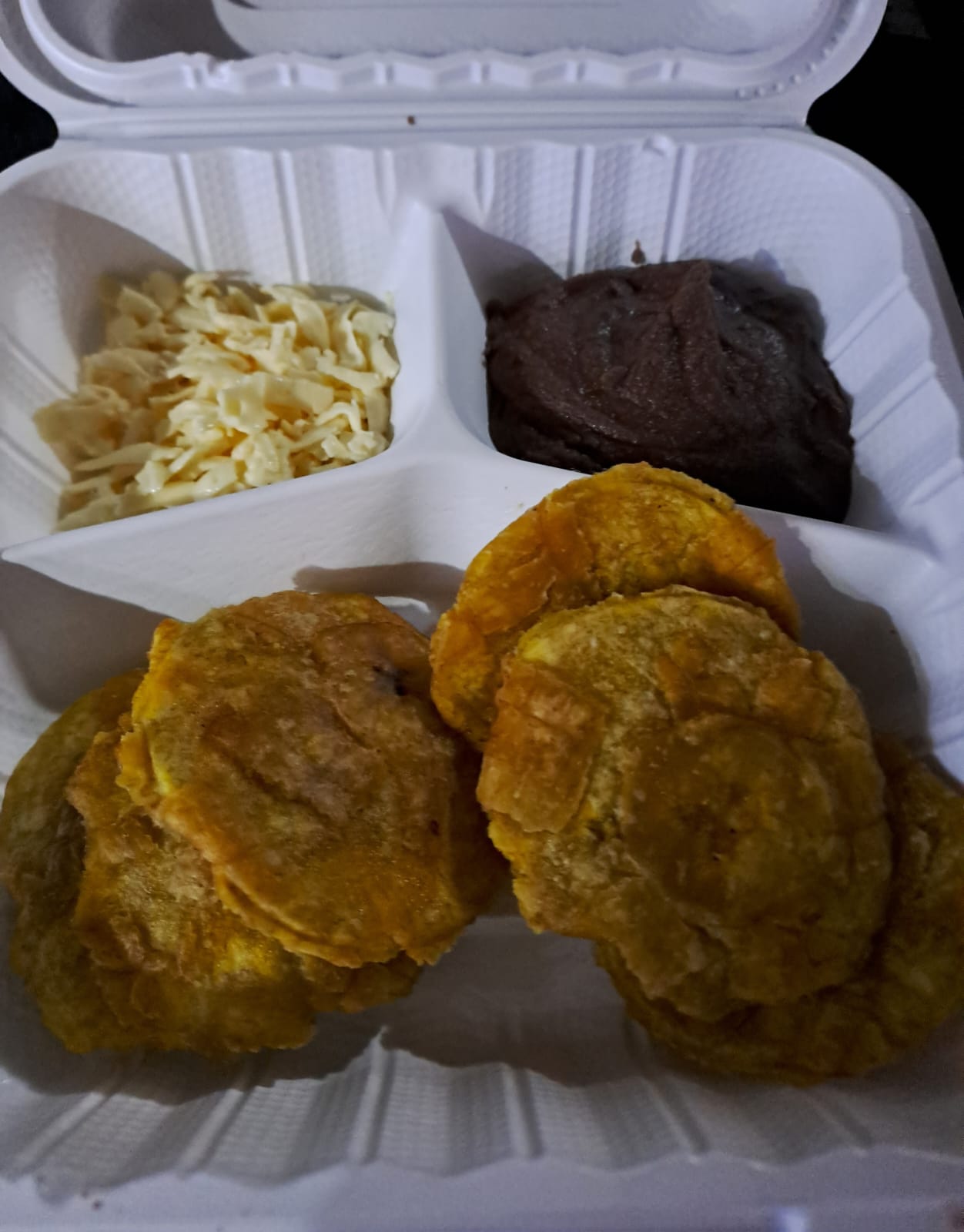 Arroz, frijoles, maduro, picadillo (papa, chorizo), ensalada verde y carne en trocitos.