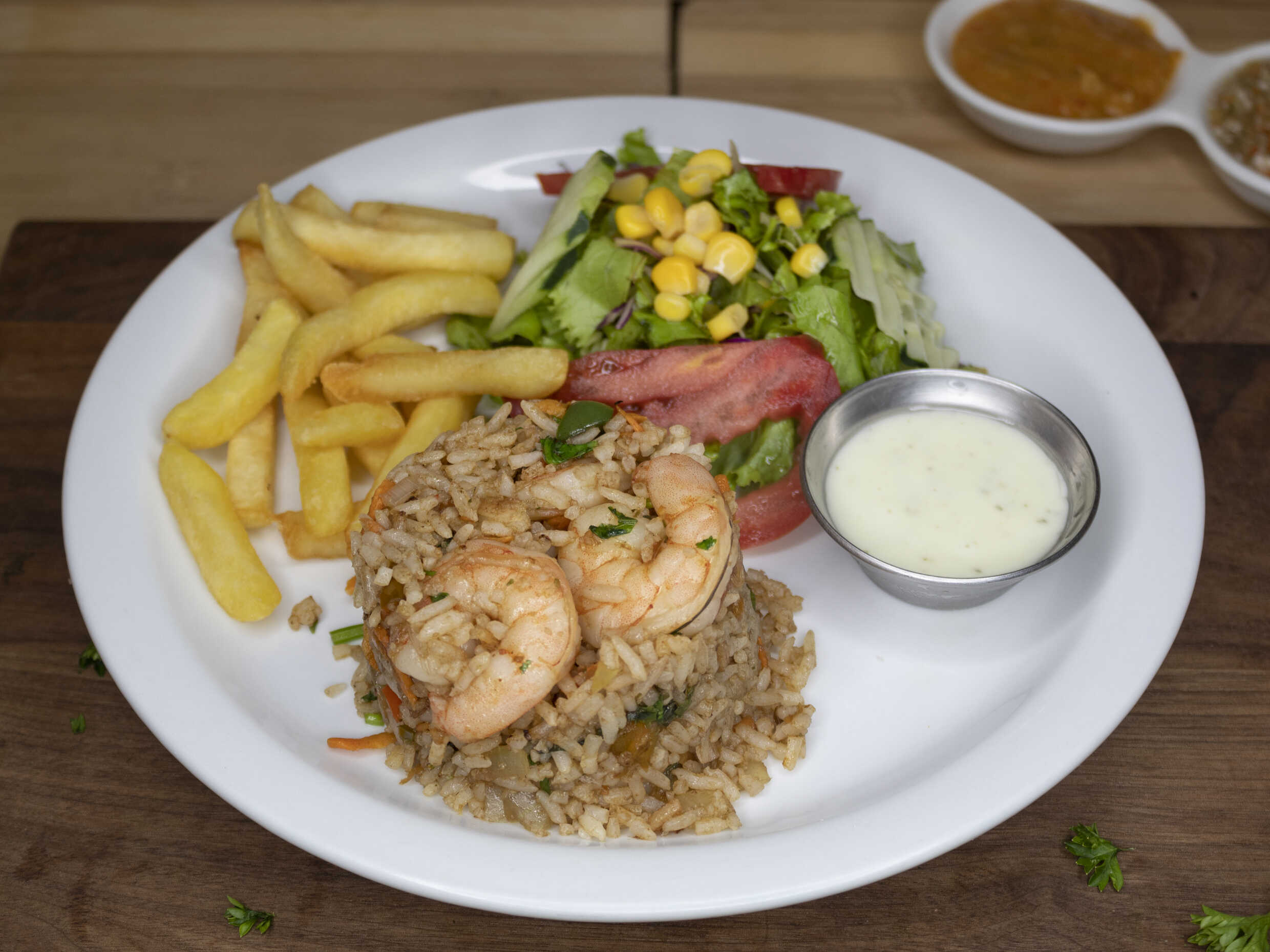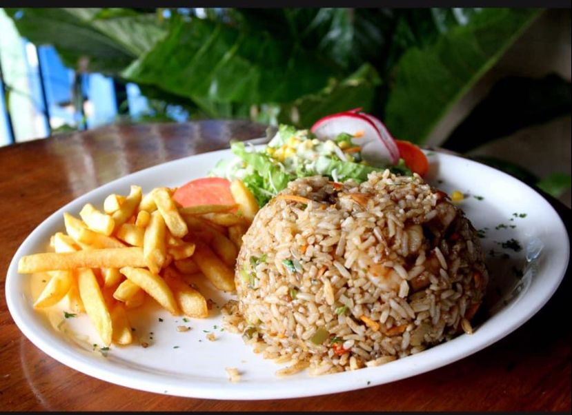 Arroz, camarones y vegetales, acompañado de papas fritas y ensalada.