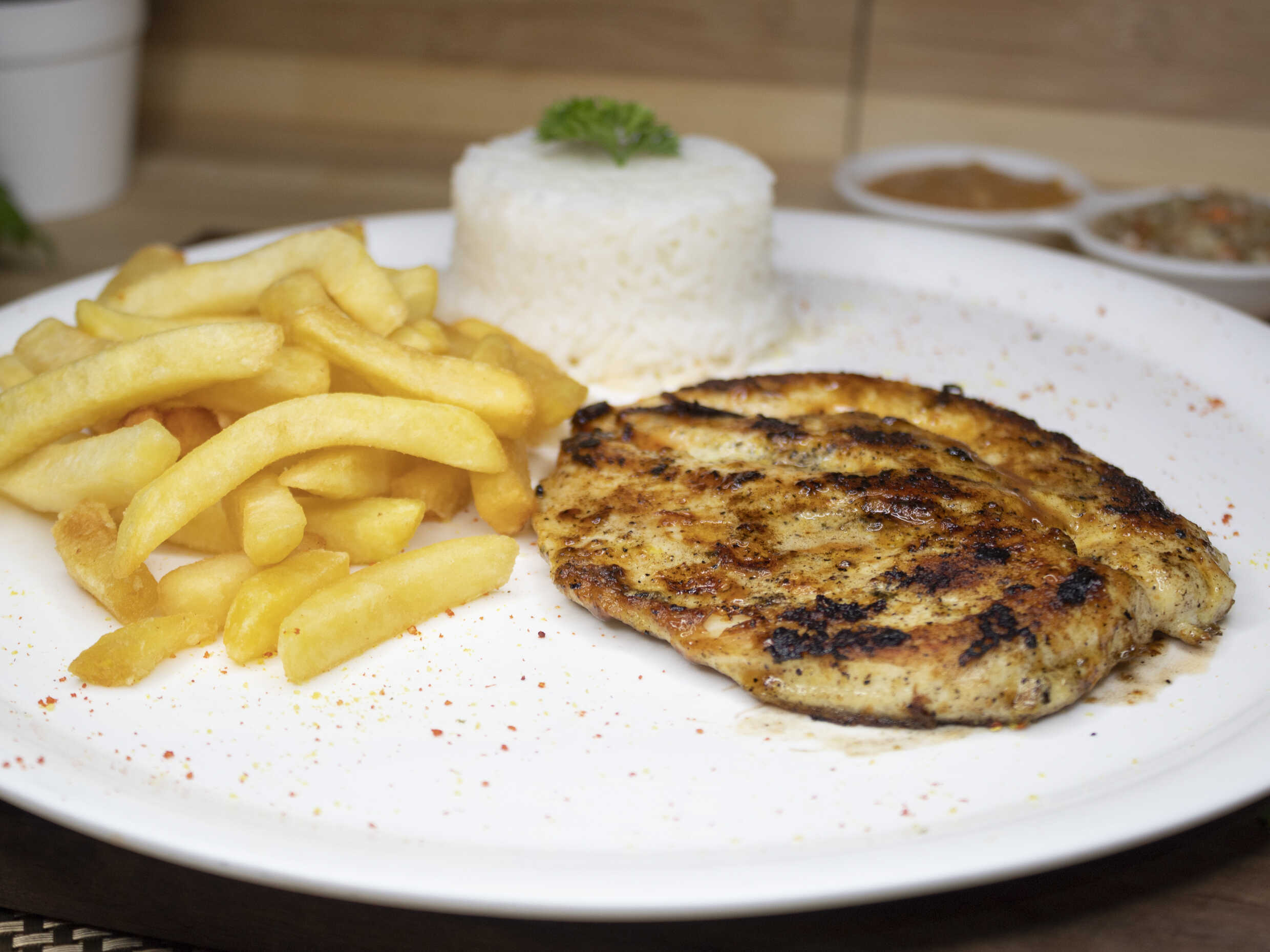 Pechuga grande de pollo, papas fritas y ensalada mixta.