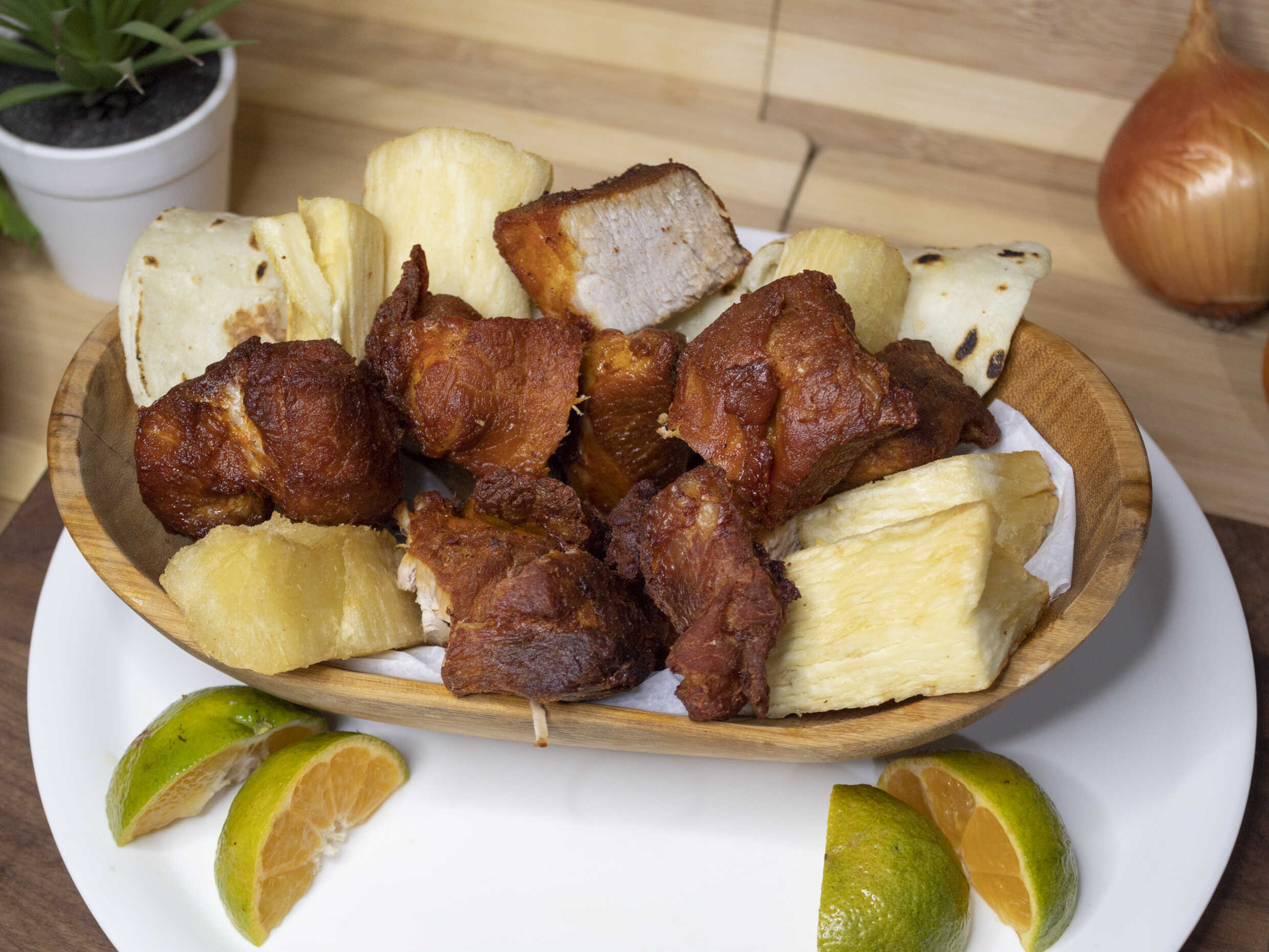 Chicharrón, tortillas palmeadas y yuca frita.