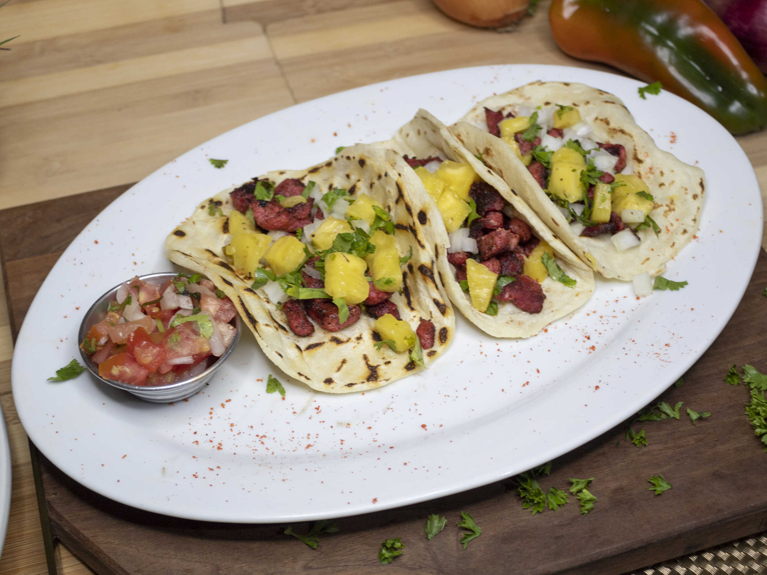 3 Tacos con carne al pastor con tortilla, cebolla, piña y culantro, acompañado de pico de gallo.