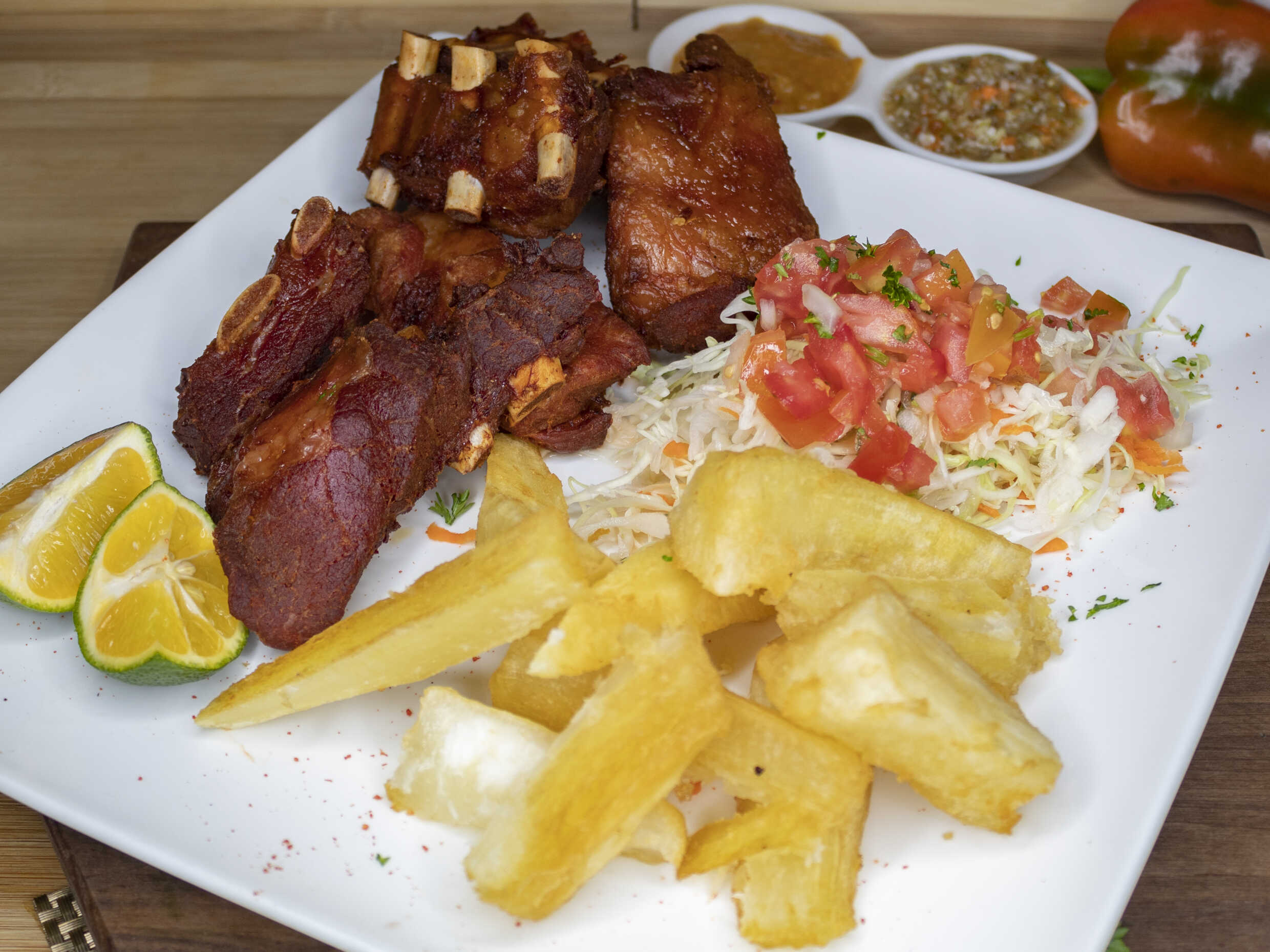 Costilla de cerdo, acompañado con ensalada, repollo y yuca frita.