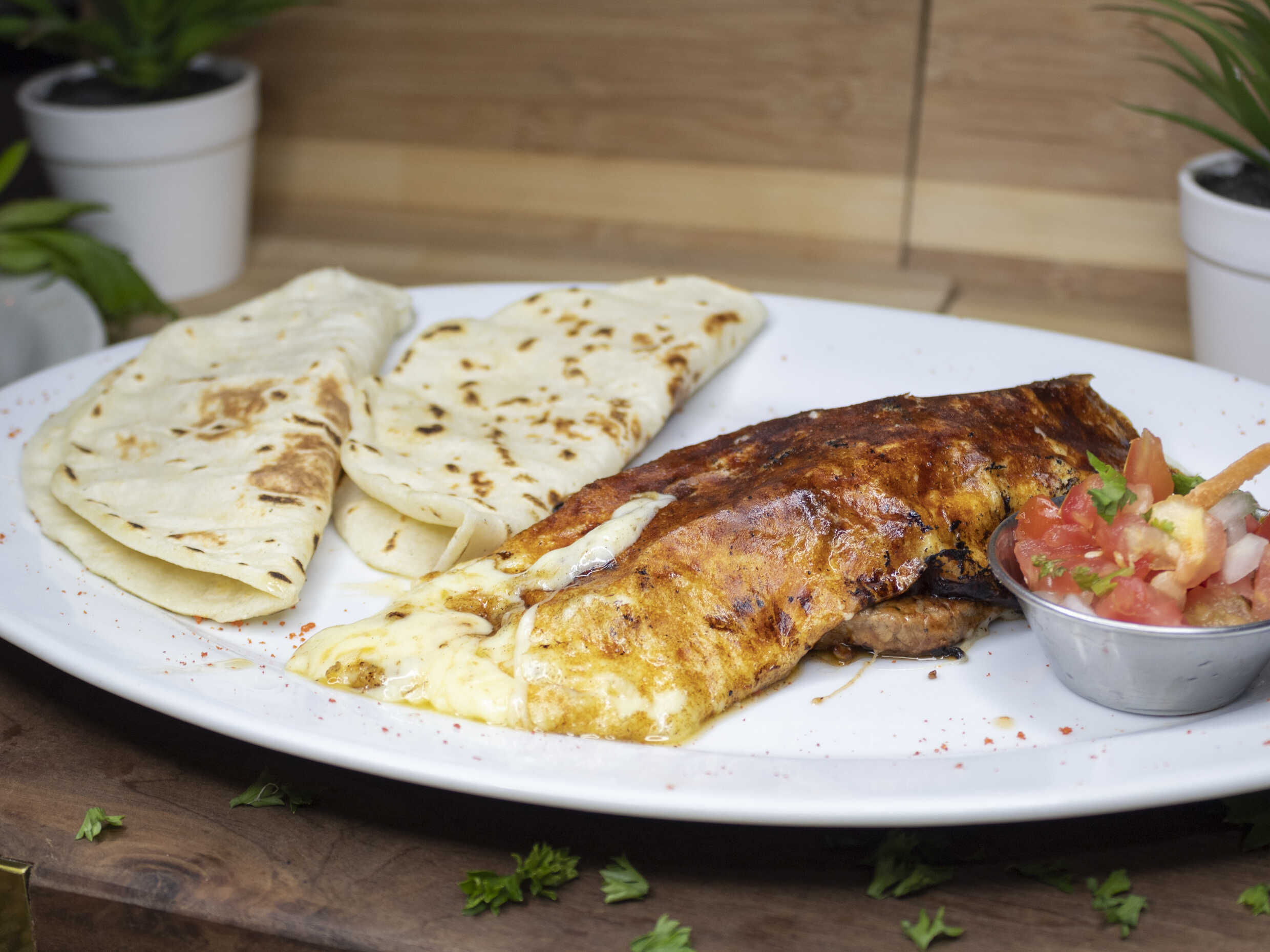 Carne al pastor envuelta en queso, con cebolla, chile y tocineta, acompañado de pico de gallo.