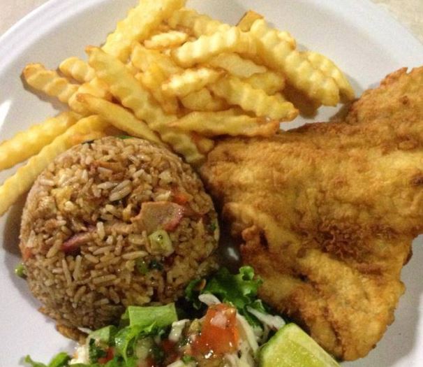 Arroz cantones, papas ,Filet de pescado empanizado, ensalada