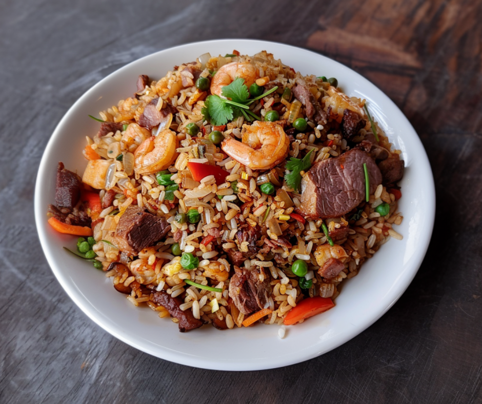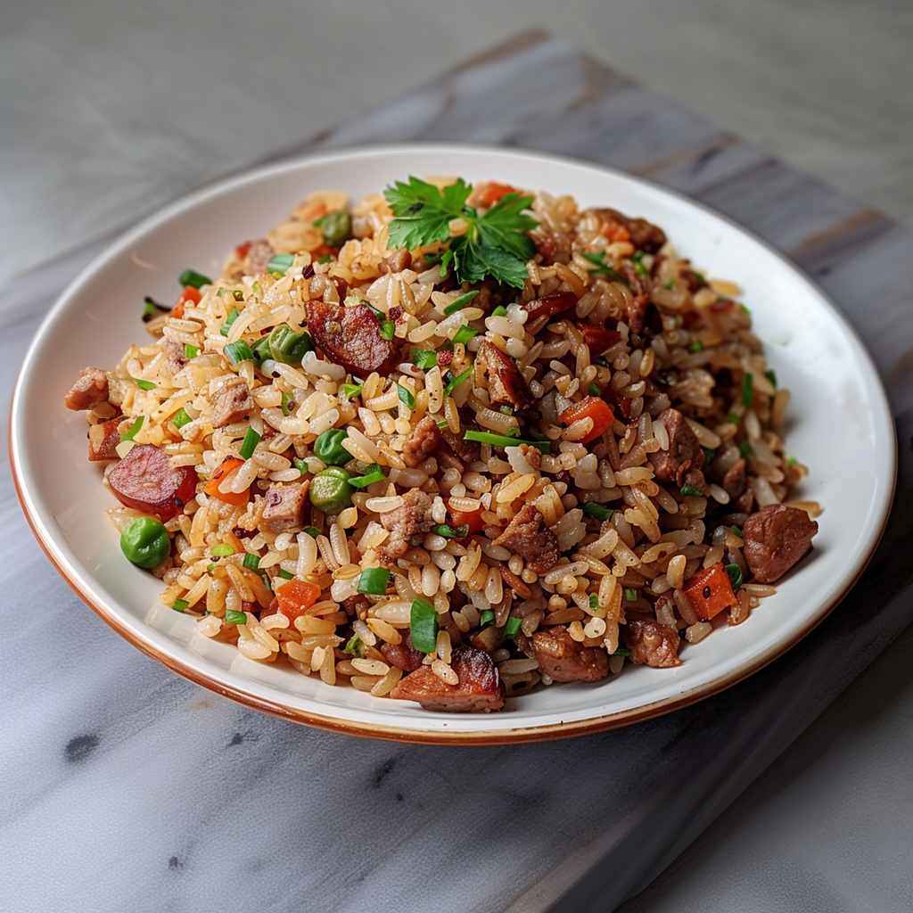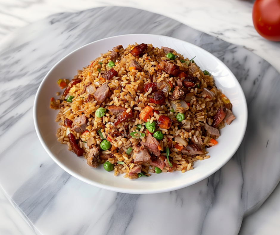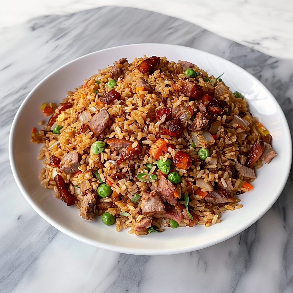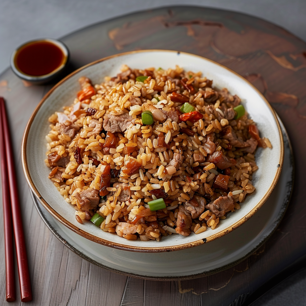 Platillo individual: aprox. 800 g de arroz cantonés con cerdo, jamón, pollo y cebollín.