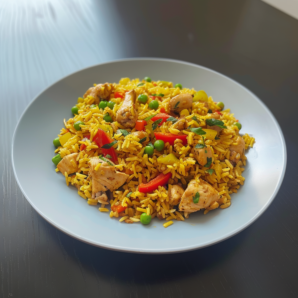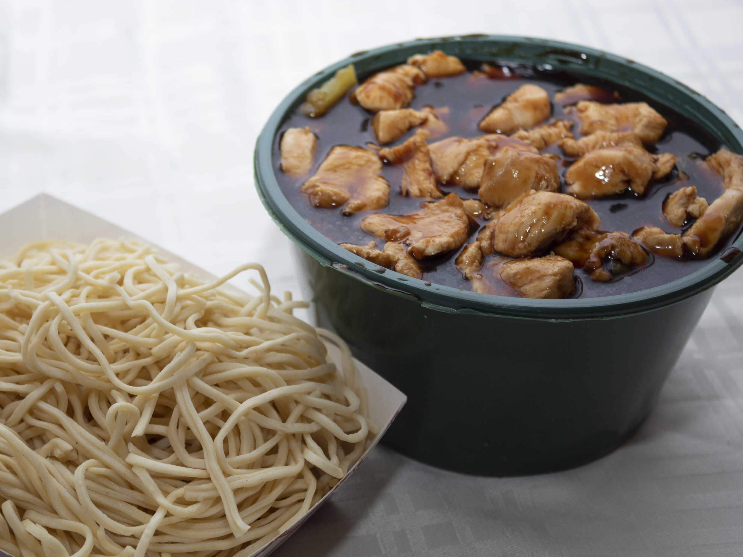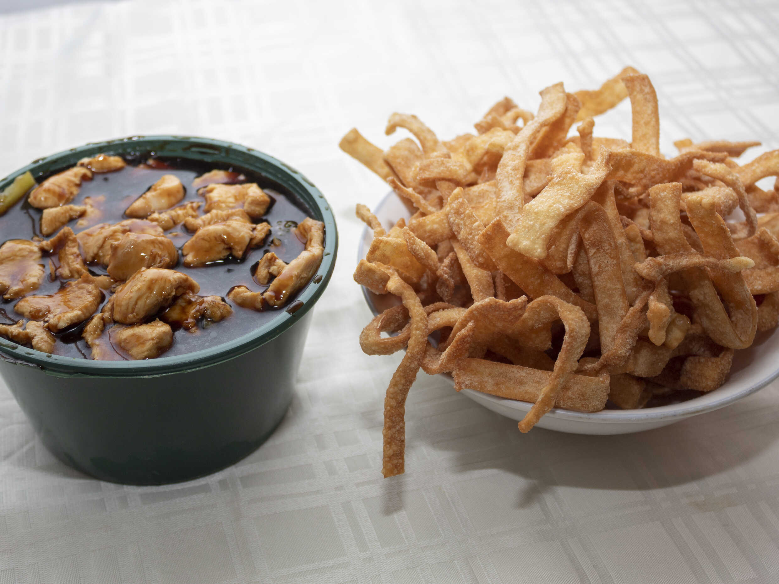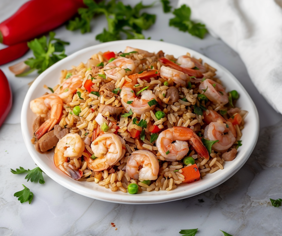 Platillo individual: aprox. 800 g de arroz cantonés con cerdo, jamón, pollo y cebollín.