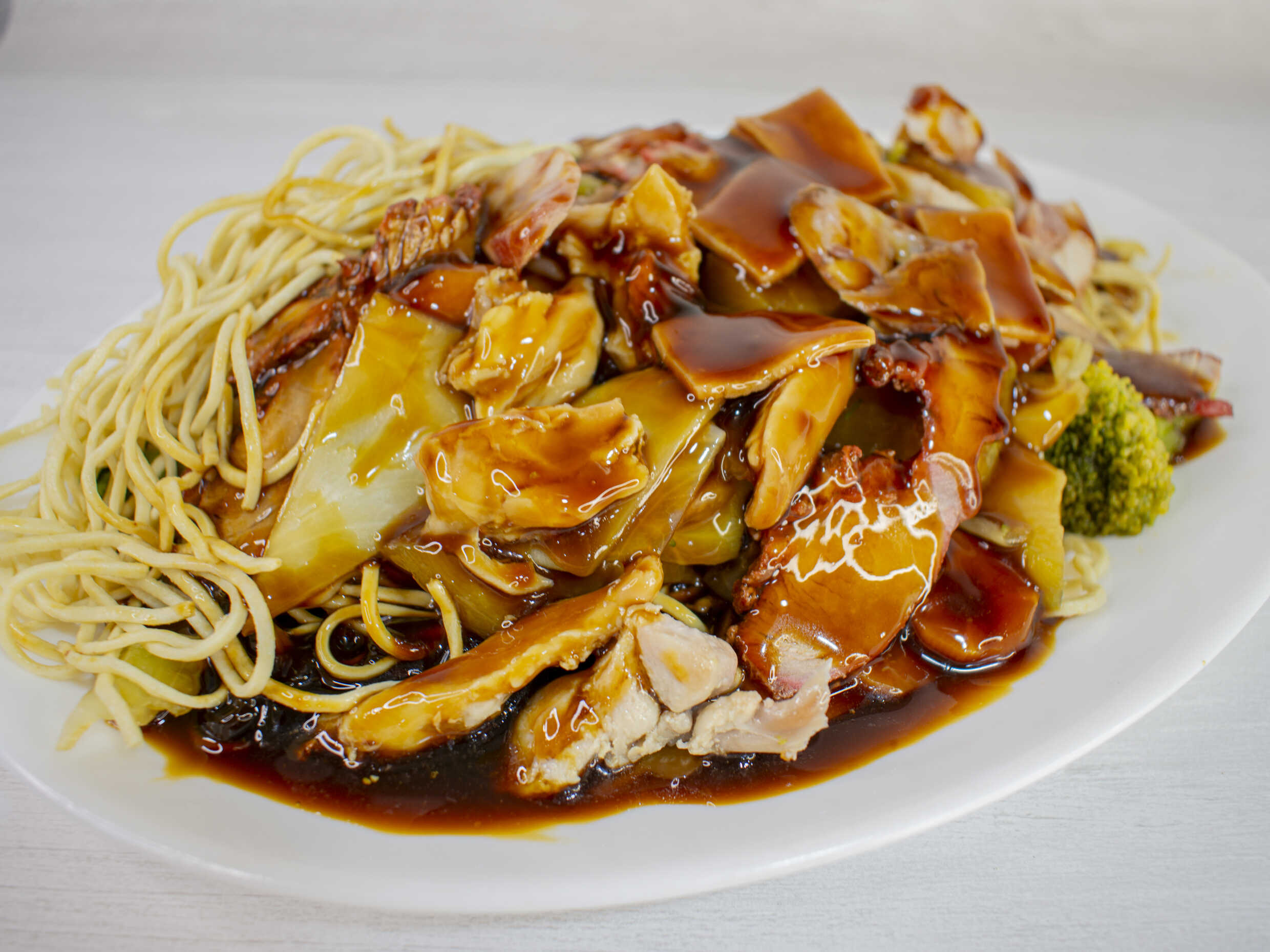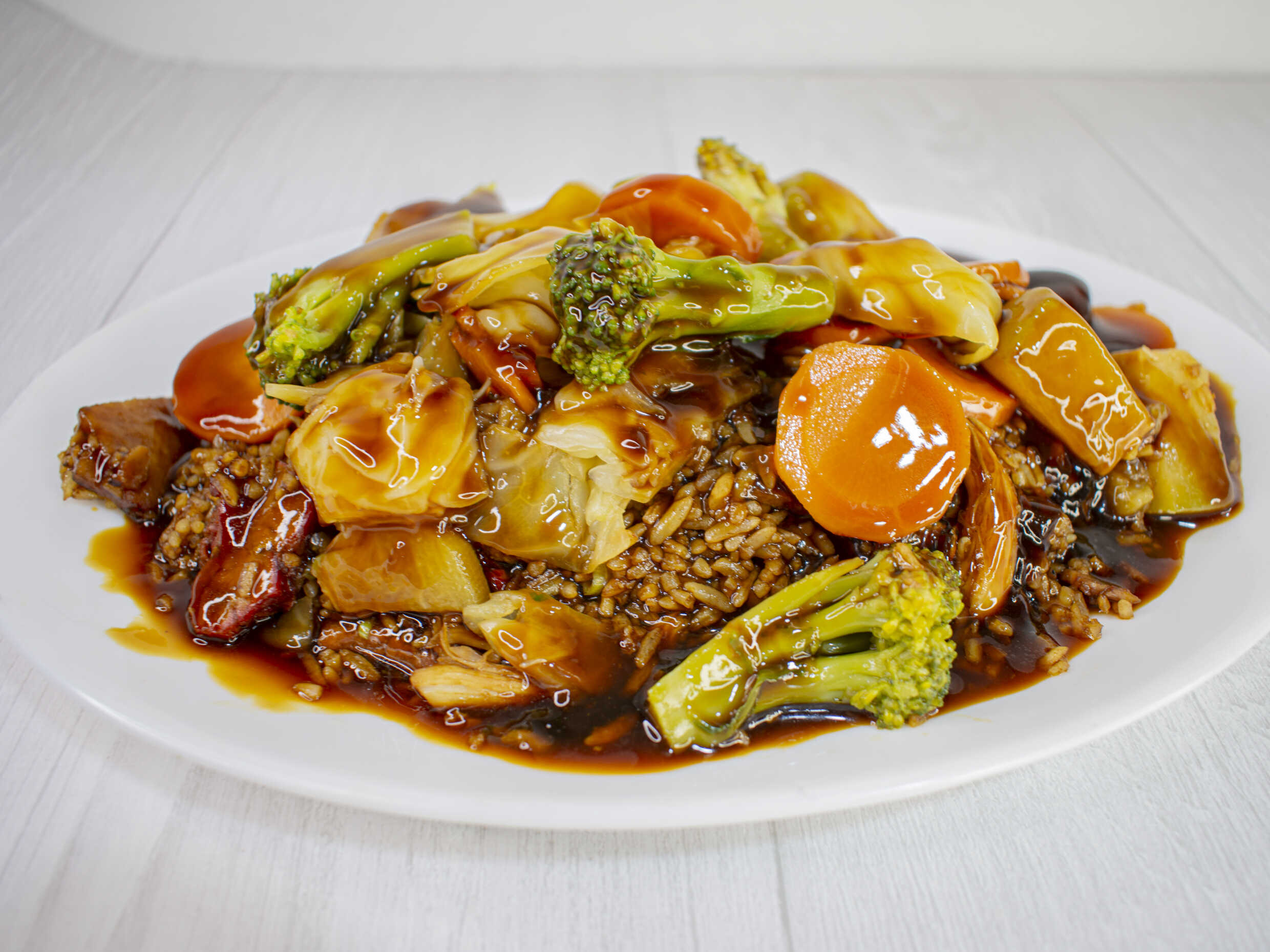 Platillo individual: ½ chop suey de camarón y pollo. Elige si lo quieres en salsa o seco.